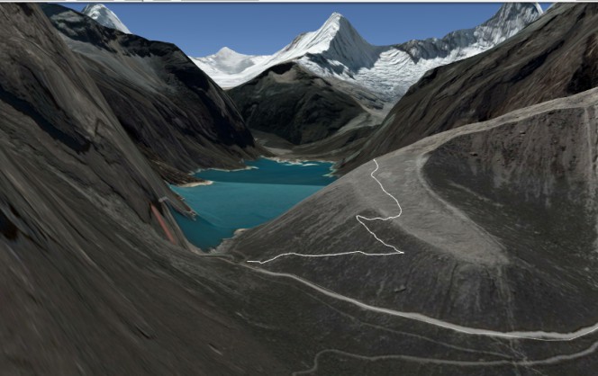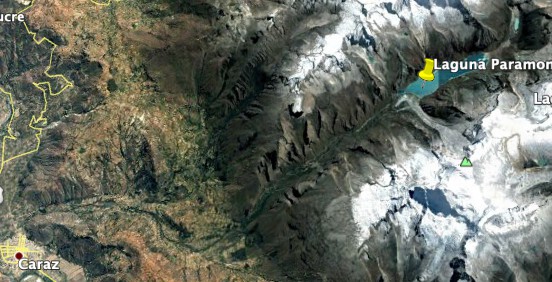 A van segue o seu trajeto por quase 2horas a mais na estrada que leva até a laguna Paron, como pode ser visto na imagem de Satélie abaixo (fonte:GoogleEarth):