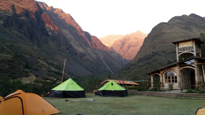 - Acampamos nessa área, chegamos já era de noite e estava muito frio, as barracas verde são de agências e a nossa está bem no cantinho da foto (laranja) . Quando tomamos café era por volta das 7h30 da manhã, conversamos com algumas pessoas de lá, até descobrirmos que este não era o camping oficial e sim o Refúgio Don Bosco (3000+m), me lembrei dos Salesianos porque trabalhei em um ONG Dom Bosco; voltando a históriam foi nos cobrado 5 soles pela estadia (que depois ficamos sabendo que podiamos ter tomado banho haha, mas agora era hora de ir embora e eles não foram tão cortez conosco).