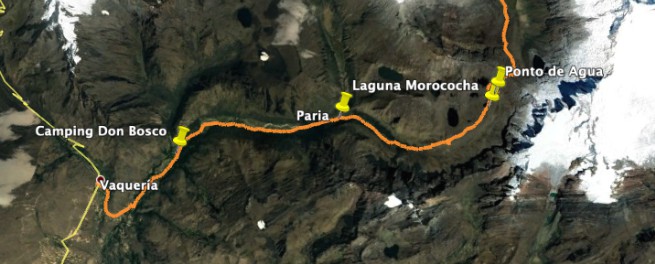 Detalhe no mapa: Início por Vaqueria fim de tarde, pernoite Camping Don Bosco, passamos por Paria local de camping também e acampamos no primeiro dia na Laguna Morococha.