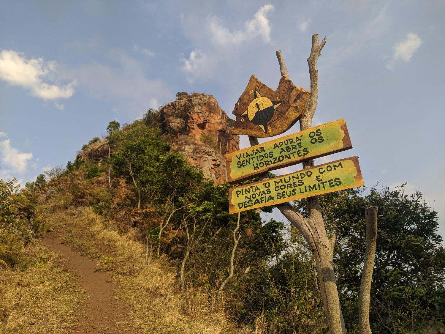 Começamos a trilha contemplando a vista, as meninas tirando fotos, até que fomos guiados pelas placas que nos levava até essa placa.