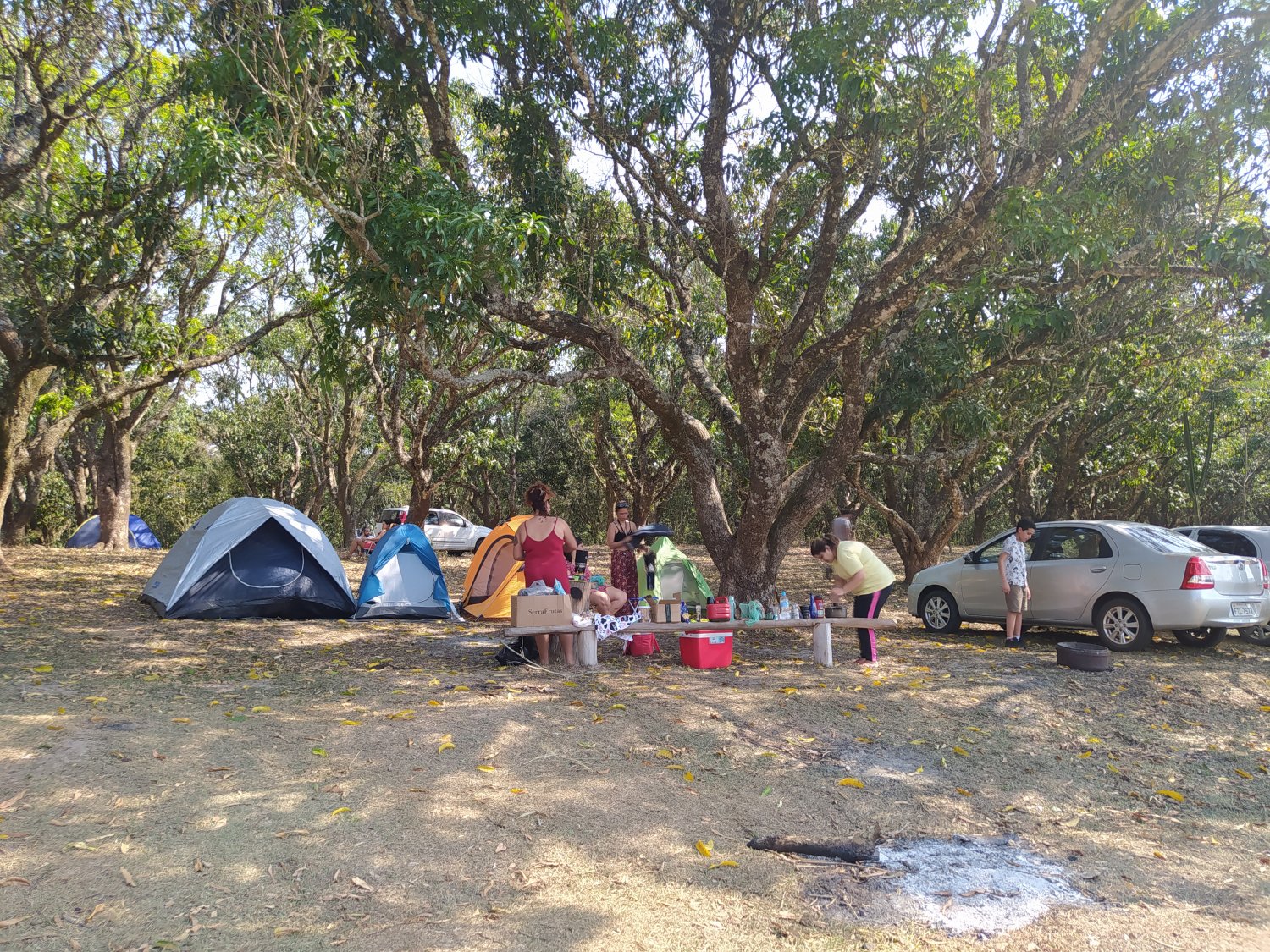 Chegando na base da Três Pedras, logo escolhemos um canto embaixo das árvores por conta do sol forte, já havia alguns carros e barracas tabém no lugar, por ser amplo é bem diverso a escolha do lugar para ficar, então os dois carros estacionaram a beira das árvores ao lado tinha um banquinho de madeira e uma "mesa" natural, onde ao chegar, uns montavam as barracas e outros ficaram preparando o almoço, á estávamos com muita fome e sede.