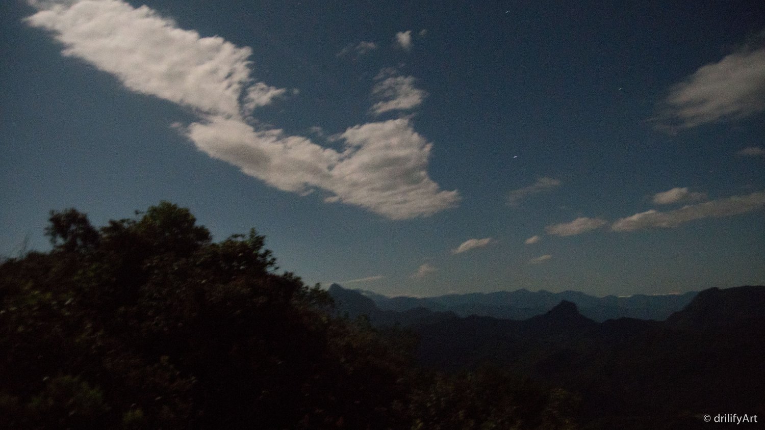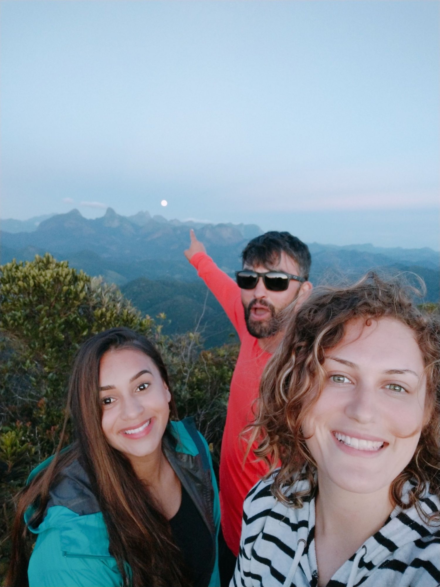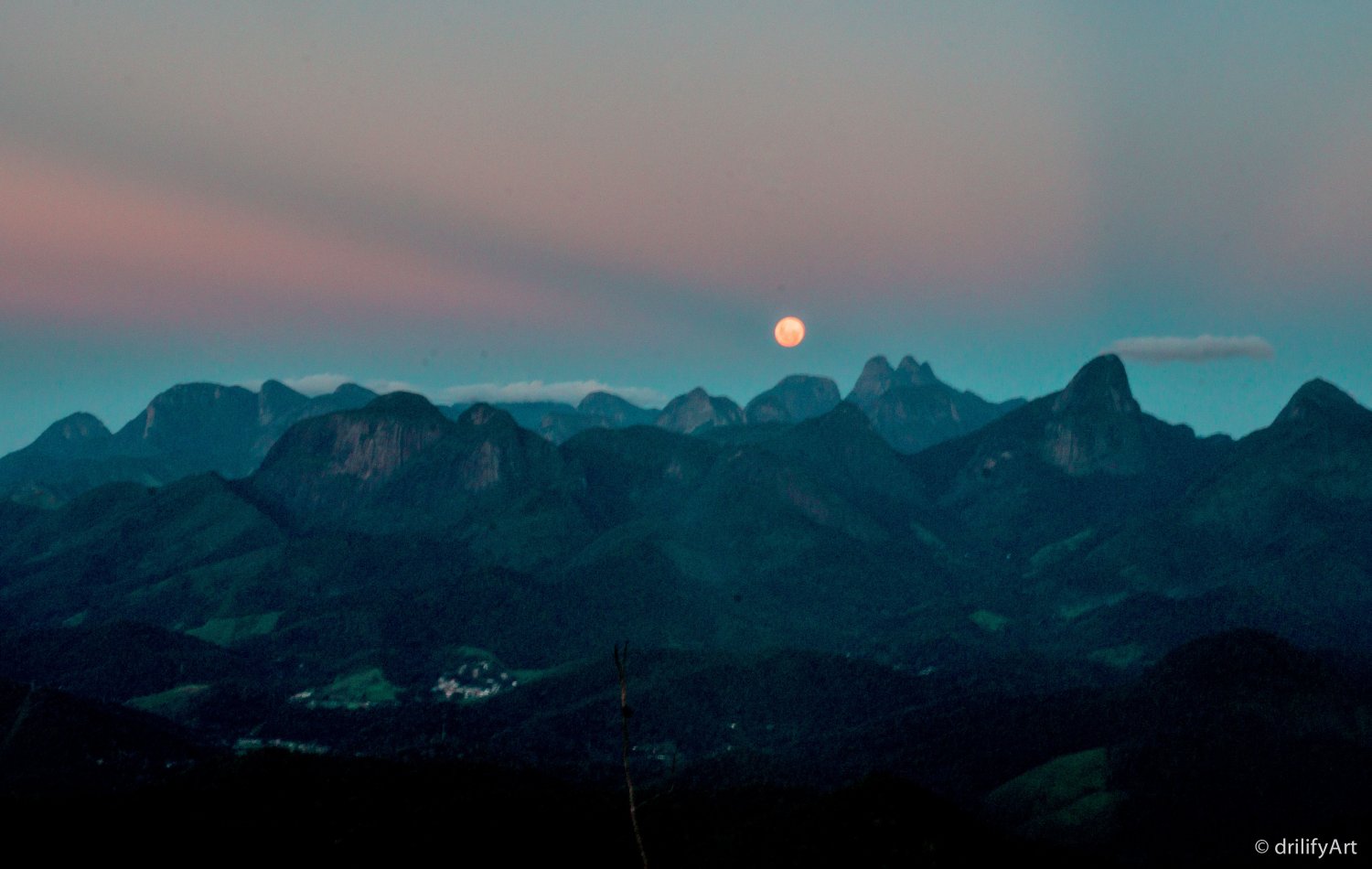 Quando ainda estávamos fitando os olhos no sol indo embora por de trás da montanha o Jorge deu um grito, quando olhamos para trás era a Lua, a superLua que estava nascendo por de trás do Capacete e Três Picos, ele com a câmera da mão conseguiu a foto mais linda de todo o rolê haha depois fomos para o outro lado curtir esse momento, ver a noite entrando e aos poucos enxergamos o Rio de Janeiro todo iluminado.