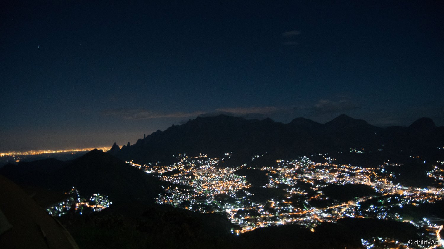 Rio de Janeiro e sua faixa luminosa ao fundo, e lado direito Teresópolis.