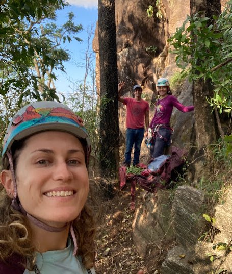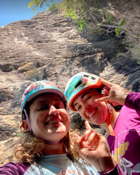 Eu tive meu primeiro contato com escalada em rocha em 2017, com o GPM e em 2018 com EscalaVale mas fiquei parada e só agora voltei a escalar de fato e tô bem gostando das vias eportivas que estou conhecendo. Maiara e Falvinho nos contou sobre os points e eu e Pati minha parceira de escalada e que de fato escala, eu só tô indo de top rope (haha) sobre as vias em falésias perto da Cachoeira dos Garcias.
