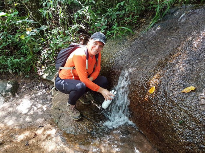 - Há muitas birfurcações nessa trilha justamente por causa de erosões, pegamos um desvio pela mangueira a nossa esquerda, onde avistamos o inicio da trilha Minha Deusa, ganhando tempo e elevaçao logo estávamos já próximos a bica de água, sempre mantendo a direita e desviando das erosões. Passamos pela bica de água e reabastecemos as garrafas!