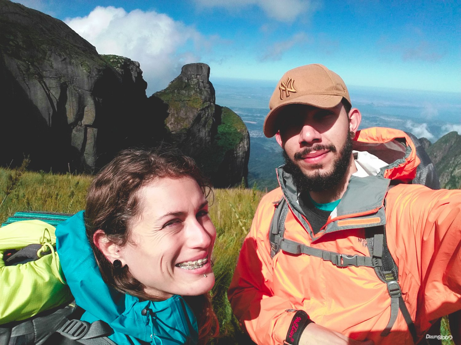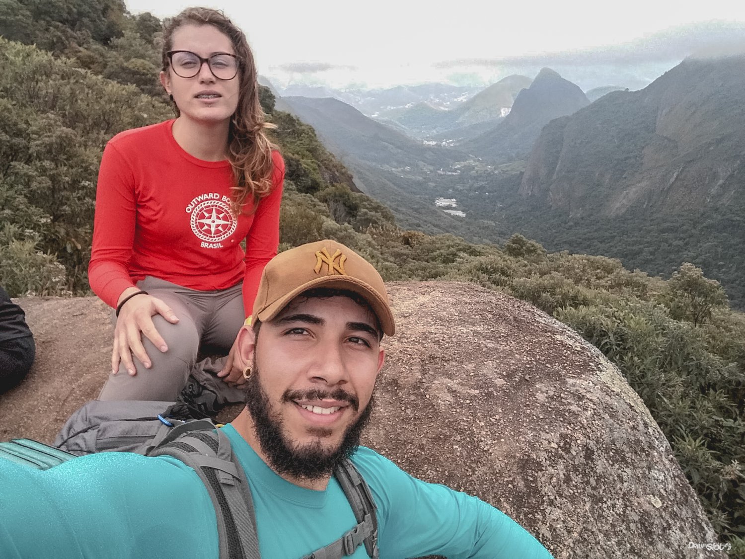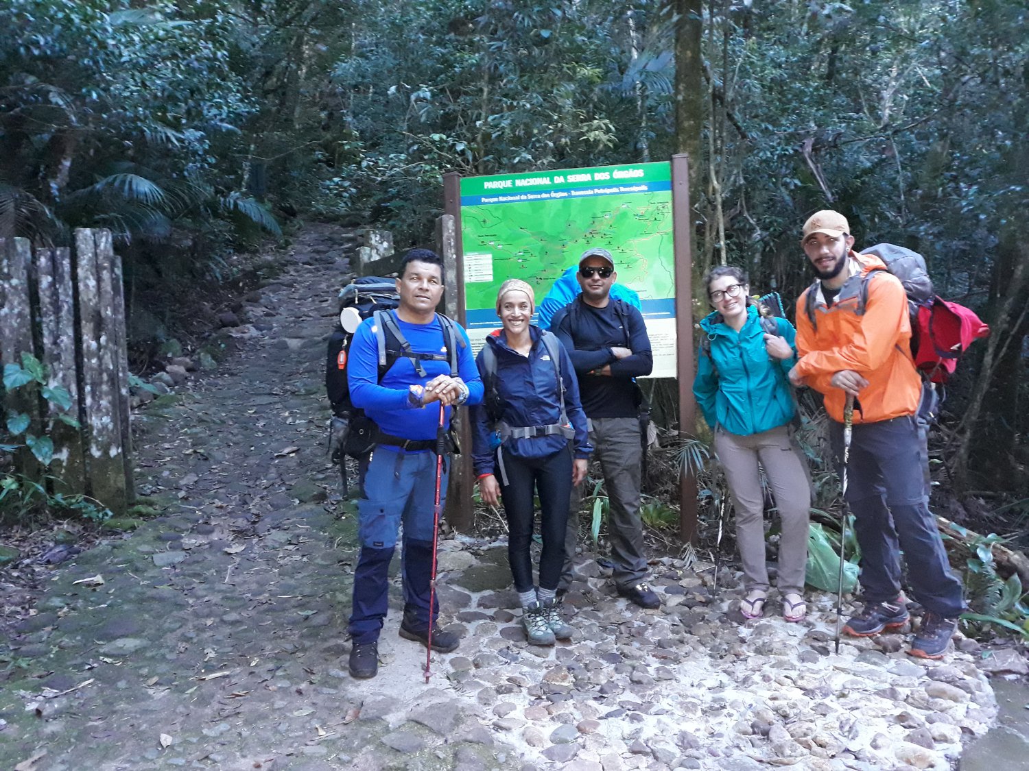 Depois disso eu poderia descer a trilha do sino a vontade haha, nós chegamos na trilha de bifurcação do Sino, subimos para contemplar outro visu da travessia e logo descemos para o Abrigo do Sino, era hora de descer, então lá tinha uma moça, a Renata que foi só de ataque ao abrigo para ir a Pedra da Baleia, e dois rapazes que estavam fazendo a travessia também em dois dias, aliás a gente encontrava com eles poucos metros da trilha. Chegamos no final da trilha era quase perto das 16h, esperamos pela van do parque as 16h30, pedidmos ao motorista da van do parque para que tirasse uma foto de nós, já que dividmos caminhada por todo aquele trajeto, valeria muito uma foto juntos.