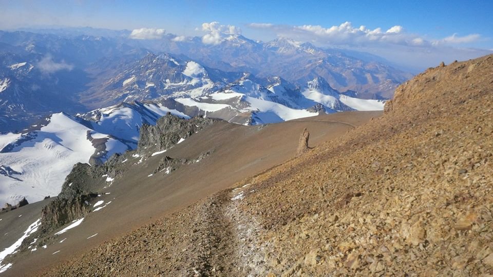 A partir dos acampamentos altos realiza-se uma ascensão em zig zags muito lentos até Plaza Independencia a 6400 metros, onde é importante não manter um ritmo se preservando para não se cansar. Há uma boa possibilidade de descanso protegido dos ventos em Piedras Blancas 6195 metros onde é permitido acampar inclusive.