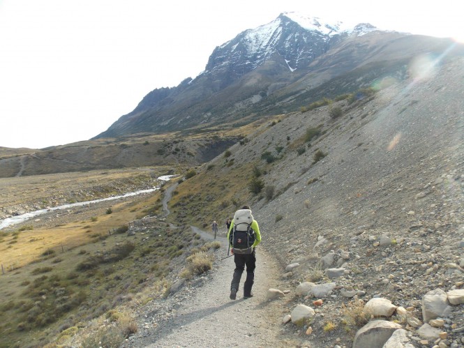 Bem, chegamos ao Campamento Los Cuernos ao fim do dia. Dificil foi arrumar um lugar pra barraca, a área estava cheia, mas a Maria conseguiu um lugar. Exaustos comemos e tomamos o banho melhor de nossas vidas. No outro dia, a rotina continuava. Arrumamos as coisas, a barraca mesmo molhada foi pra mochila e começamos mais um dia, uma pernada razoável até o Campamento Britanico, a meta era dormir por lá e subir o Vale do Frances no outro dia.