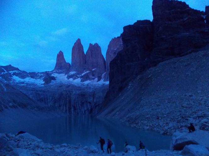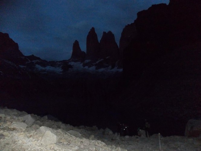 Depois de uma boa pernada chegamos ao Campamento chileno quase anoitecendo, banho quente, comida e cama , digo , barraca, pois no outro dia a caminhada começaria cedo, as 4 hr, porque o plano era chegar nas Torres antes de amanhecer pra ver o espetaculo. Quando o sol nasce , as torres ficam amarelas, parecem de ouro, rs . Bem, como planejado partimos numa trilha bem dificil a noite, pedras soltas já chegando nas torres atrapalhavam muito, mas conseguimos.