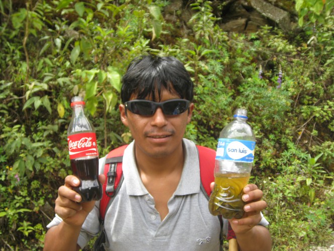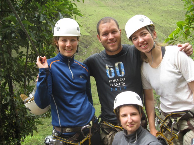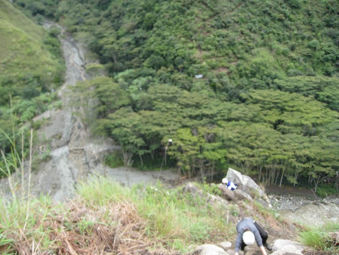 No outro dia, acordamos e arrumamos as coisas para seguir sentido a hidroelétrica. Uma grande surpresa assim que saímos: durante a noite havia ocorrido um grande deslizamento de terra na rua do hostel. Acredito que a terra ficou com coisa de 4 ou 5 metros de altura, e isso foi exatamente ao lado do hostel. Passamos pelo deslizamento e seguimos para um breve trekking em uma montanha (esqueci o nome, rs) onde após subirmos descemos por meio de várias tirolesas instaladas entre a montanha que estávamos e uma montanha ao lado. Sensacional! Após isso, seguimos rumo a hidrelétrica e nas últimas três horas seguimos próximos à linha do trem até Águas Calientes, onde chegamos no início da noite. Depois de cinco dias falando inglês e espanhol, foi ótimo encontrar um pessoal do Brasil assim que cheguei lá.