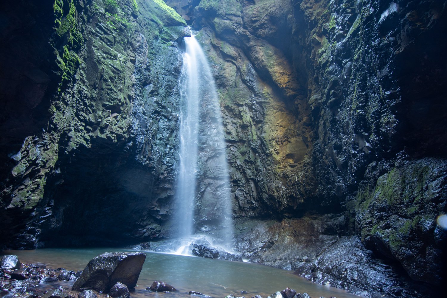 Depois da caminhada de quatro quilômetros e de algumas escorregadas chegamos a queda d'água, conhecida também como cachoeira do cânio, linda de mais! É quase uma mistura de gruta com caverna... Contemplamos. Após alguns registros era hora de voltar, na sombra fazia frio, isso já passava das dez e meia da manhã.