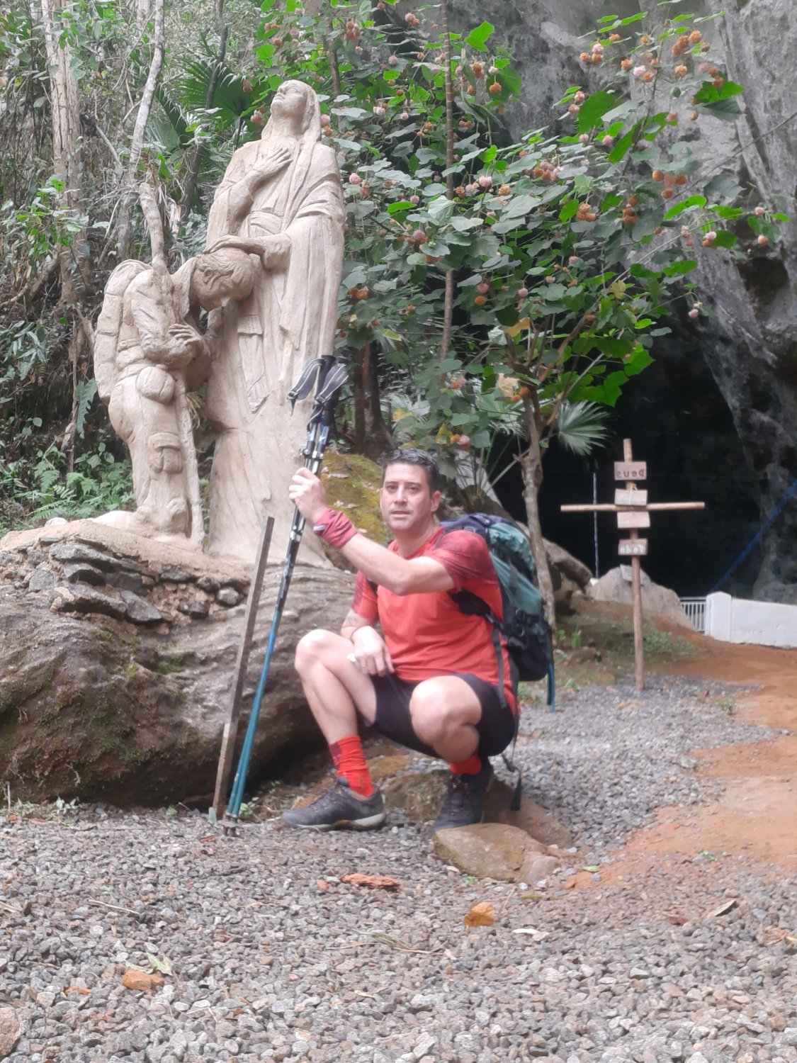 Diga-se de passagem, esse foi o único trecho em que o mato estava um pouco alto, mas segui em frente ate encontrar a trilha novamente. Depois de algumas horas caminhando, enfim, cheguei a gruta de Nossa Senhora de Lourdes. Já tinha assistido a videos, mas presenciar pessoalmente é algo único. A gruta emana paz, uma energia forte de dentro dela que me tocou. Fiquei ali paralisado por alguns minutos , me recompondo antes de seguir adiante. Soube depois que no domingo, 17/07 é realizado uma missa anual no local e que uma grande peregrinação realizada pela ABRALUZ se iniciaria na segunda 18/07, saindo de Tombos.