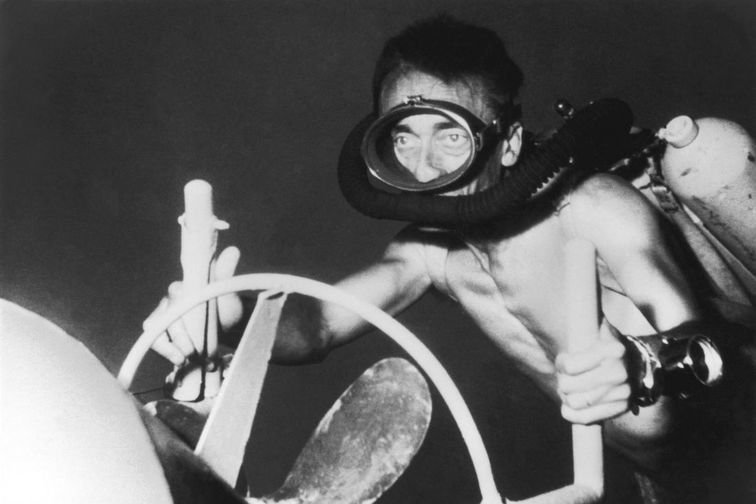 Jacques Cousteau e sua criação, o Aqualung. foto: youtube