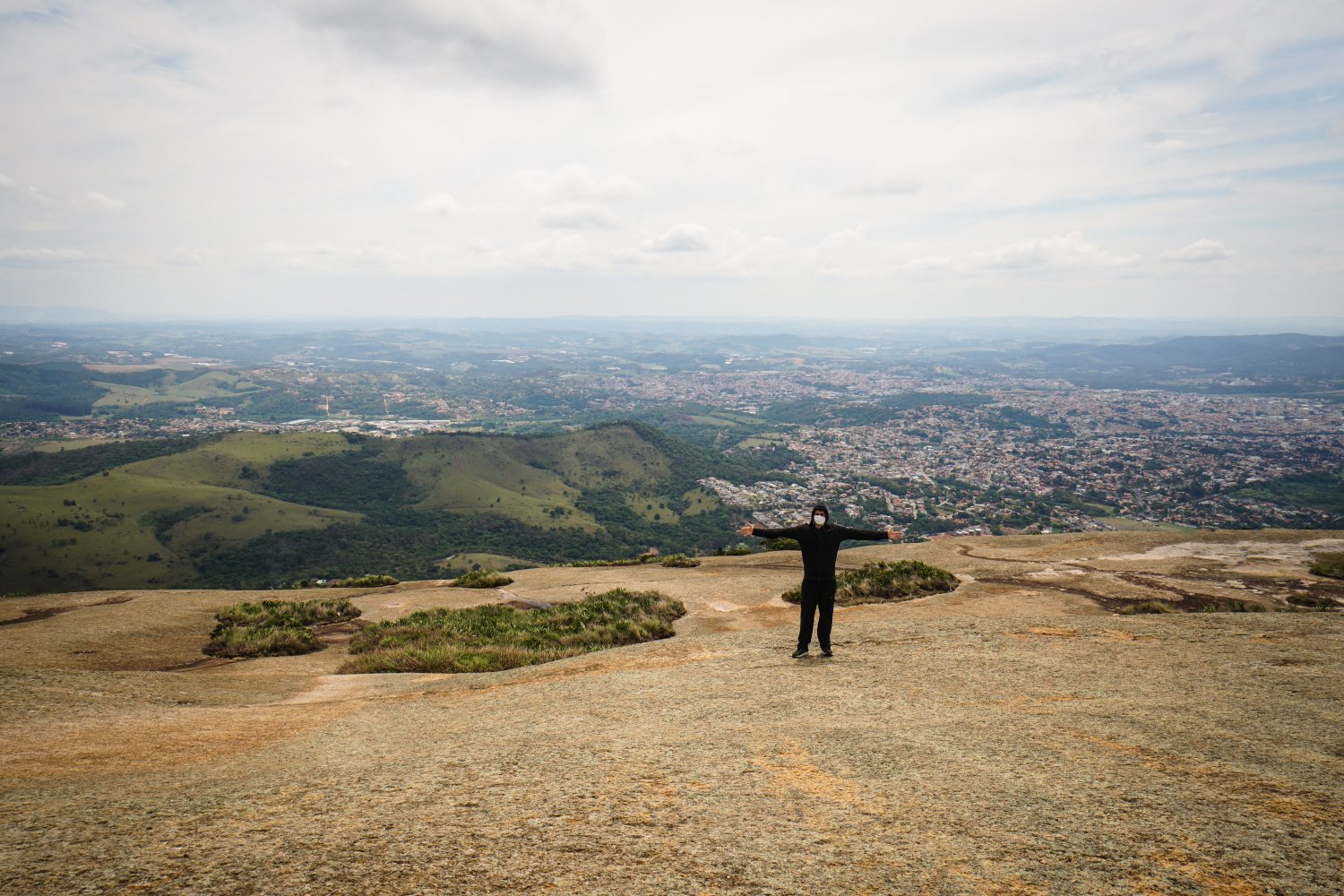 Na sequência, fomos de carro até o nosso destino principal: a Pedra Grande de Atibaia. Chegando lá, havia profissionais do Parque Estadual orientando sobre o estacionamento e a necessidade de uso de máscaras buscando proteger os turistas do contágio da Covid-19.