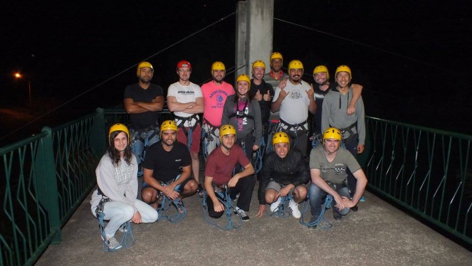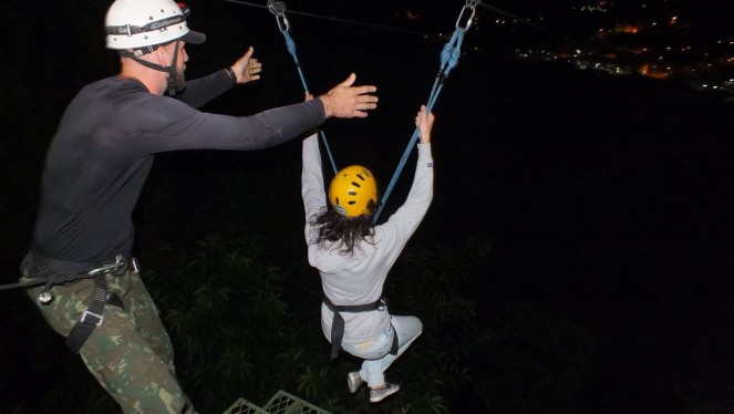 Rafting concluído, tomamos um banho, fizemos um lanche rápido e seguimos para a segunda parte da aventura: a tirolesa. Já estava anoitecendo quando chegamos ao lugar onde seríamos equipados. A própria empresa levou a gente de Kombi, saindo do ponto de encontro até a base da descida. Essa tirolesa tem 1km de extensão e corta a cidade por cima. Como já estava noite, acho que a noção de altura ficou um pouco distorcida, entretanto dava para deduzir que era bem alto já que as casas viravam miniaturas vistas de cima.