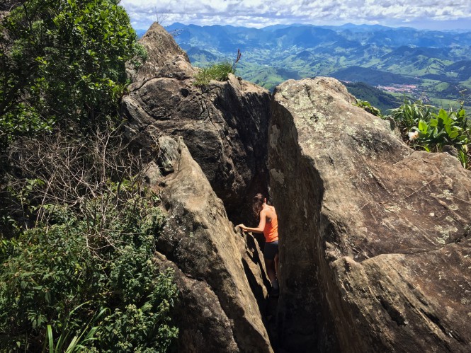 Deixamos todo o pessoal para trás, e seguimos pela trilha da Ana Chata. A primeira parte da caminhada é tranquila, com bastante sombra, trilha bem demarcada e bons trechos de descida. Há alguns poucos lugares onde é preciso um pouco mais de atenção, mas nada além do normal. Quase no cume, vem uma das partes mais desafiadoras: a subida pelos pequenos trechos de via ferrata. Passa-se por dentro de uma caverna, e em seguida por lugares que, mesmo com as proteções de ferro, são bem próximos ao precipício. Confesso que fiquei com um medinho rsrs, mas me concentrando no próximo passo e não olhando tanto para baixo chegamos até o cume. O cume da Ana Chata também estava lotado, desde escaladores até outras pessoas que encontramos na trilha. Lá de cima é possível ver o lado oposto da Pedra do Baú (em relação ao Bauzinho). De fato, sua imponência e beleza nos deixam uns minutos abismados admirando aquela obra prima da natureza.