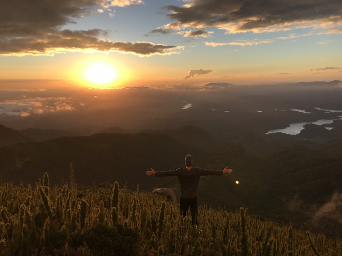 Barracas armadas, pegamos o nosso chimarrão fiel e companheiro e fomos ao lado oposto da montanha em relação ao acampamento assistir ao por do sol. Sentamos em uma pedra e ficamos admirando a paisagem, de onde é possível ver a represa do Rio Capivari, à direta o Pico Taipa (ou Taipabuçu) e à esquerda o morro Itapiroca. Lindo, indescritível e emocionante. Todo o esforço valeu a pena!