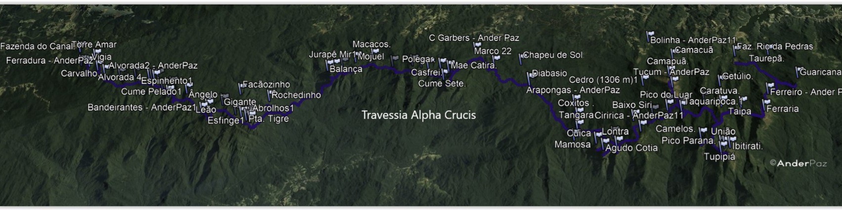 Trekking Mountaineering Long DistanceA Alpha Crucis é uma união de três Serras que percorre os cumes dos três principais blocos montanhosos da Serra do Mar do Paraná, ela foi realizada pela primeira vez no ano de 2002 por Élcio Douglas e Jurandir Constantino na época percorreram 44 montanhas em 10 dias.