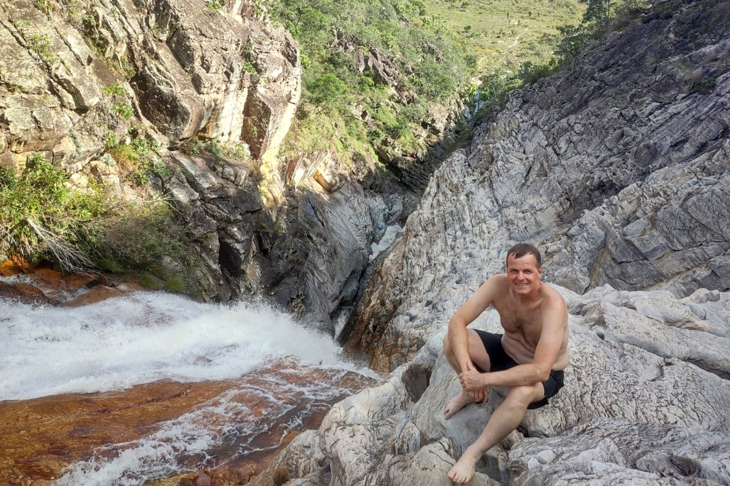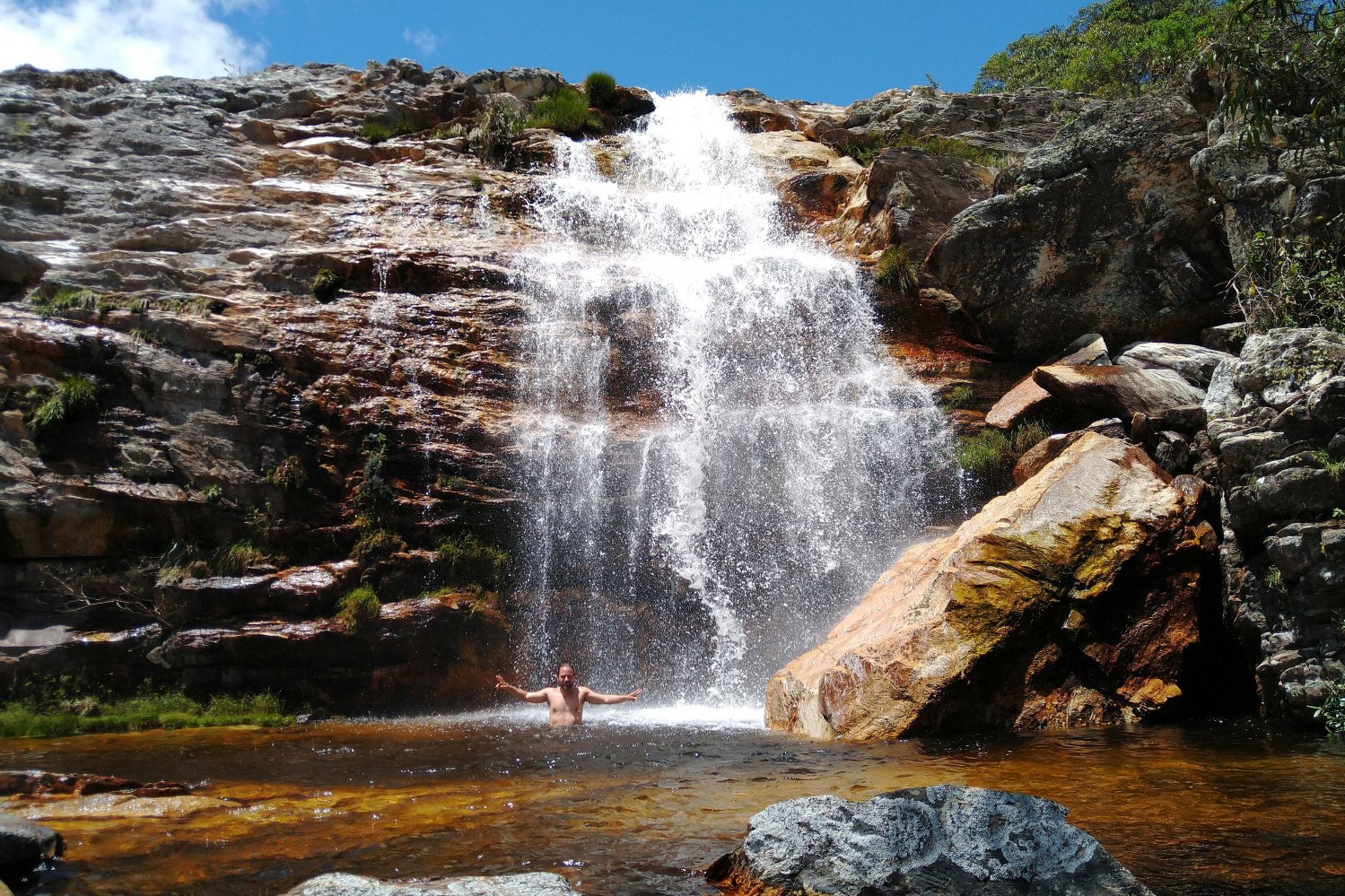 Fernando aproveitando para se refrescar na cachoeira Samambaia, antes de encarar uma subida árdua na volta para o acampamento.