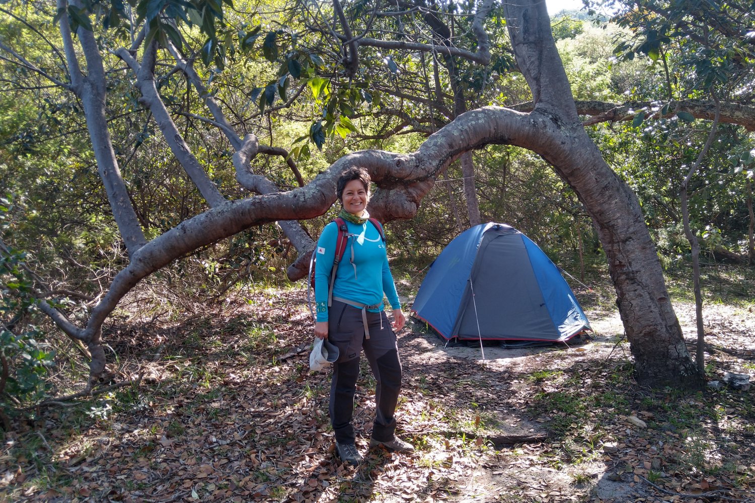 Depois de duas horas e meia de subida chegamos à cachoeira Horizontes, cartão postal da região, onde fizemos uma breve parada para algumas fotos. Em seguida, subimos mais um pouco em busca de um bom ponto para montar o acampamento, que encontramos na margem oposta do ribeirão Fechados, em um local isolado, sombreado e bastante agradável.