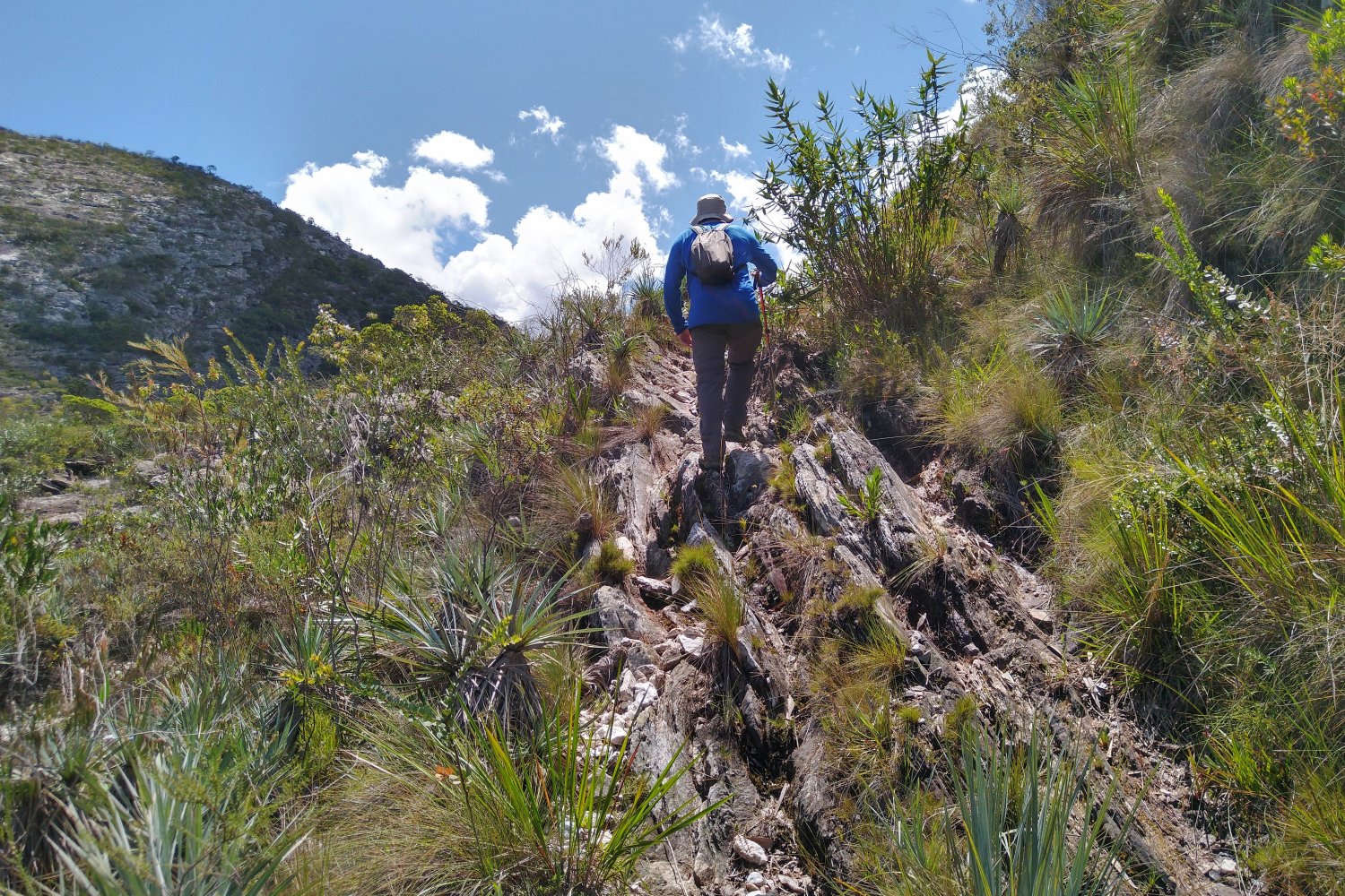 A primeira parte da caminhada percorre o alto da serra por uma região de campo, com belas paisagens, mas bastante alterada pela pecuária e pelo fogo ao longo dos anos. Um emaranhado de caminhos feitos pelo gado dificultou bastante a navegação, tornando o GPS imprescindível. Em alguns pontos a trilha desaparecia por completo, enquanto em outros reapareceria bem marcada no solo, muitas vezes acompanhada por outras trilhas paralelas. Perder o rumo em alguns momentos foi inevitável.