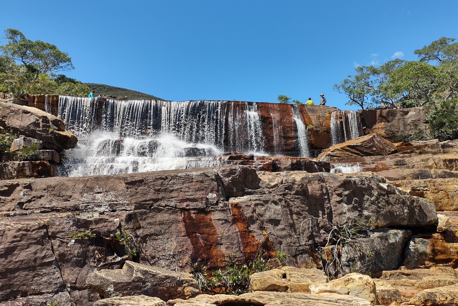 A terceira cachoeira visitada no dia foi a Horizontes, cartão postal de Fechados, caracterizada por cortes em ângulo reto nas rochas de quartzito, que lhe atribuem um desenho peculiar, além de uma extensa borda infinita, com um visual espetacular de toda a região. Haja rolo de filme!
