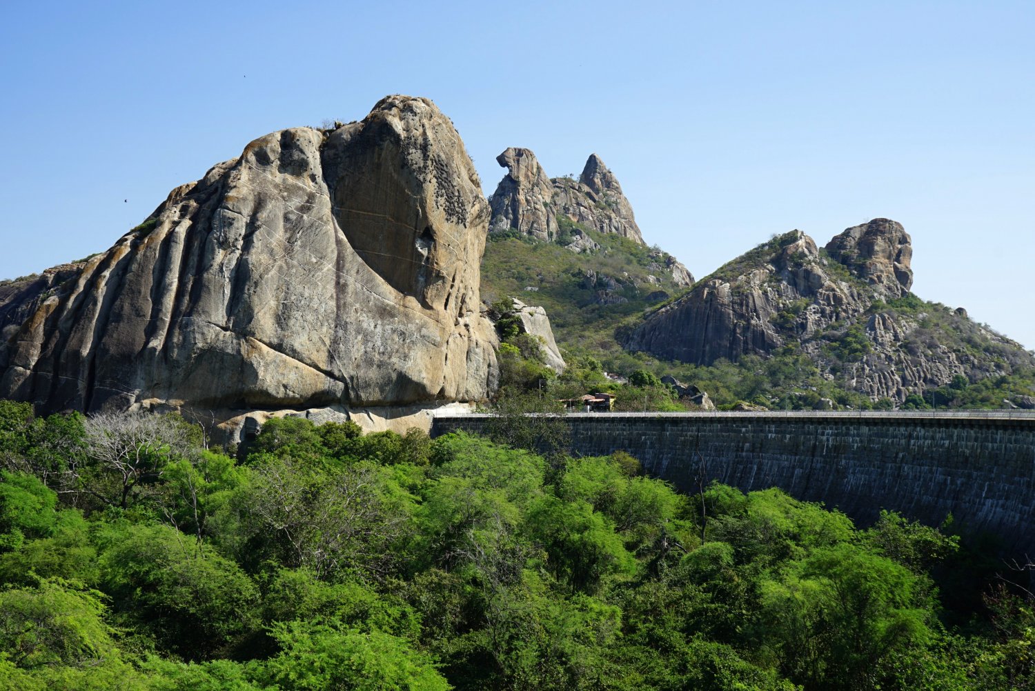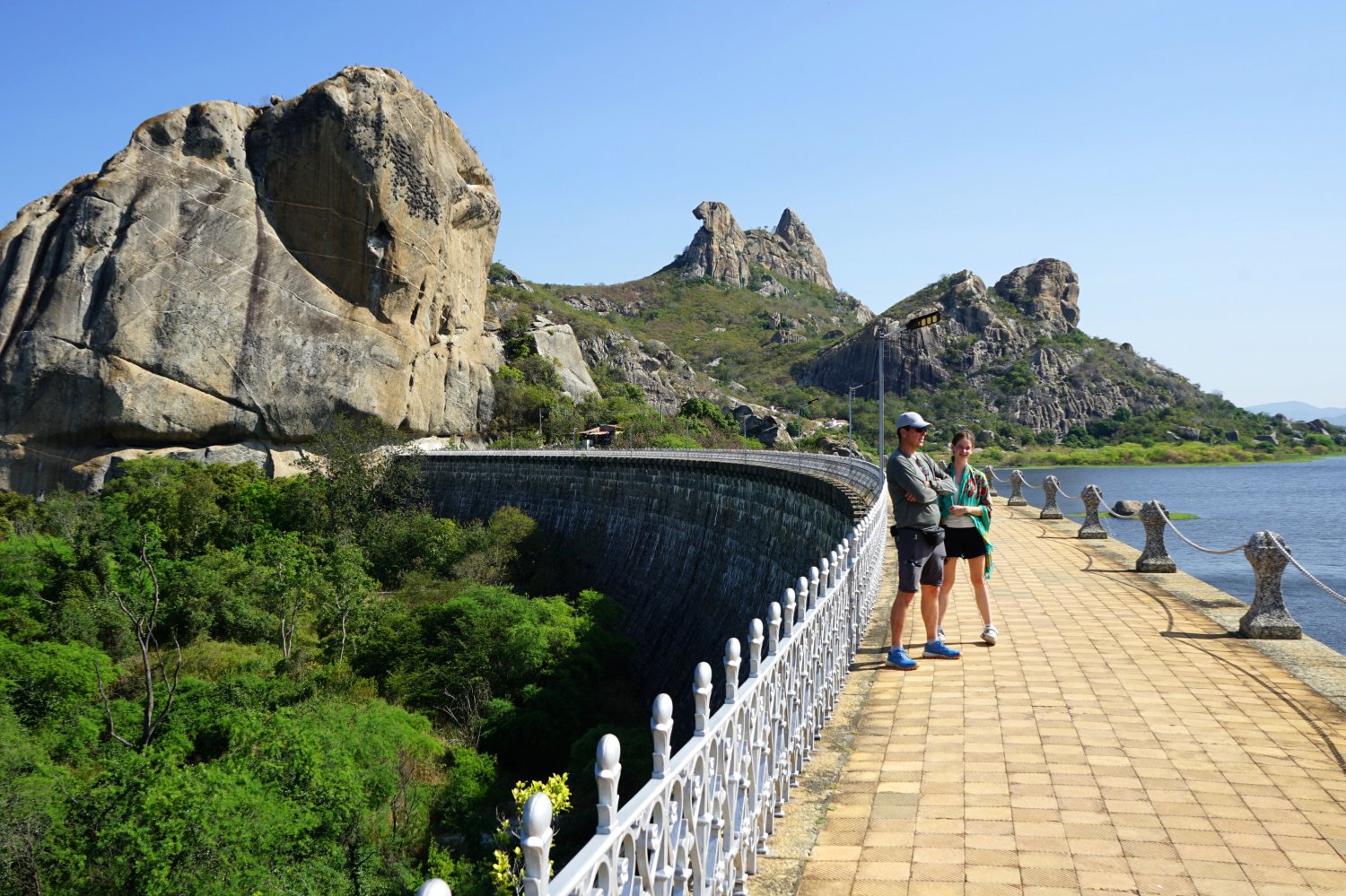 Em seguida caminhamos pela barragem principal do Açude do Cedro, uma belíssima obra de engenharia em arco, com um guarda-corpo trabalhado em ferro e pilares em cantaria, de onde se tem uma das melhores vistas da Pedra da Galinha Choca e dos monolitos no entorno, dentre eles a Pedra da Faladeira, a Pedra Cabeça de Leão e a Pedra do Pombo.