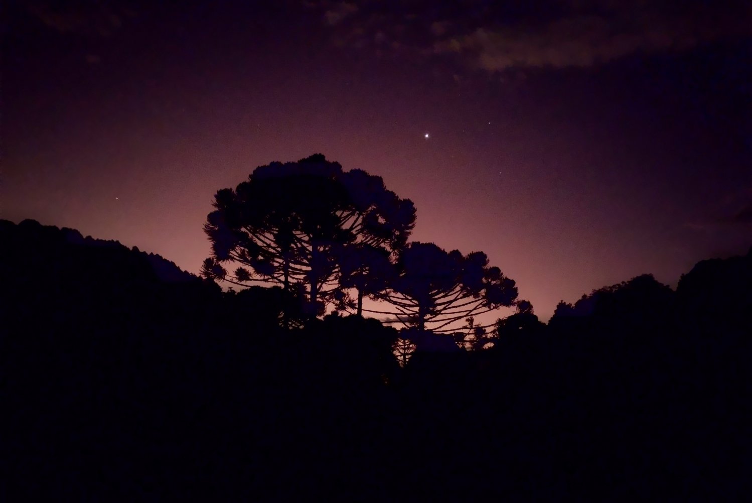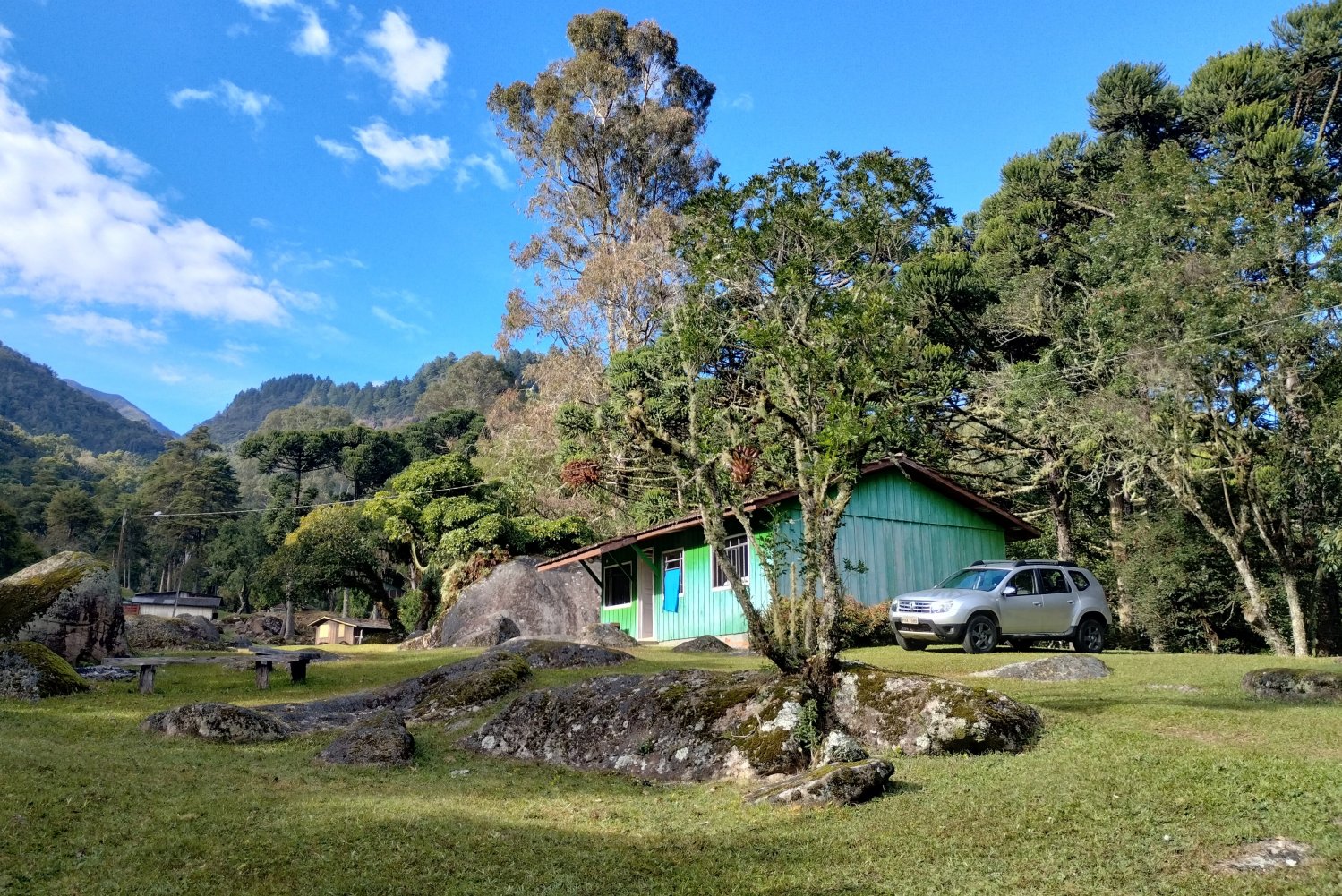 Seguindo as dicas fornecidas pelos colegas montanhistas paranaenses, alugamos um chalé na fazenda Rio das Pedras, em Campina Grande do Sul, ao lado do posto do Instituto Água e Terra (IAT), no Parque Estadual Pico Paraná. Uma propriedade bela e muito bem cuidada, com um ar bucólico proporcionado pelos gramados, morros e córregos, cercados por florestas de pinus e araucárias. Um verdadeiro paraíso de paz e sossego, já que éramos os únicos que estavam por lá. Aproveitamos a tarde para caminhar pelas trilhas, visitar a cachoeira e coletar alguns pinhões.