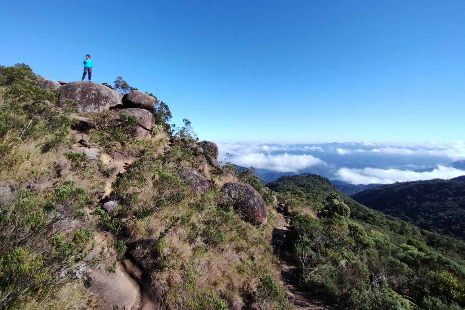 Trecho inicial da caminhada, em uma bela manhã de sol e céu azul, com os vales ainda tomados pelas nuvens.
