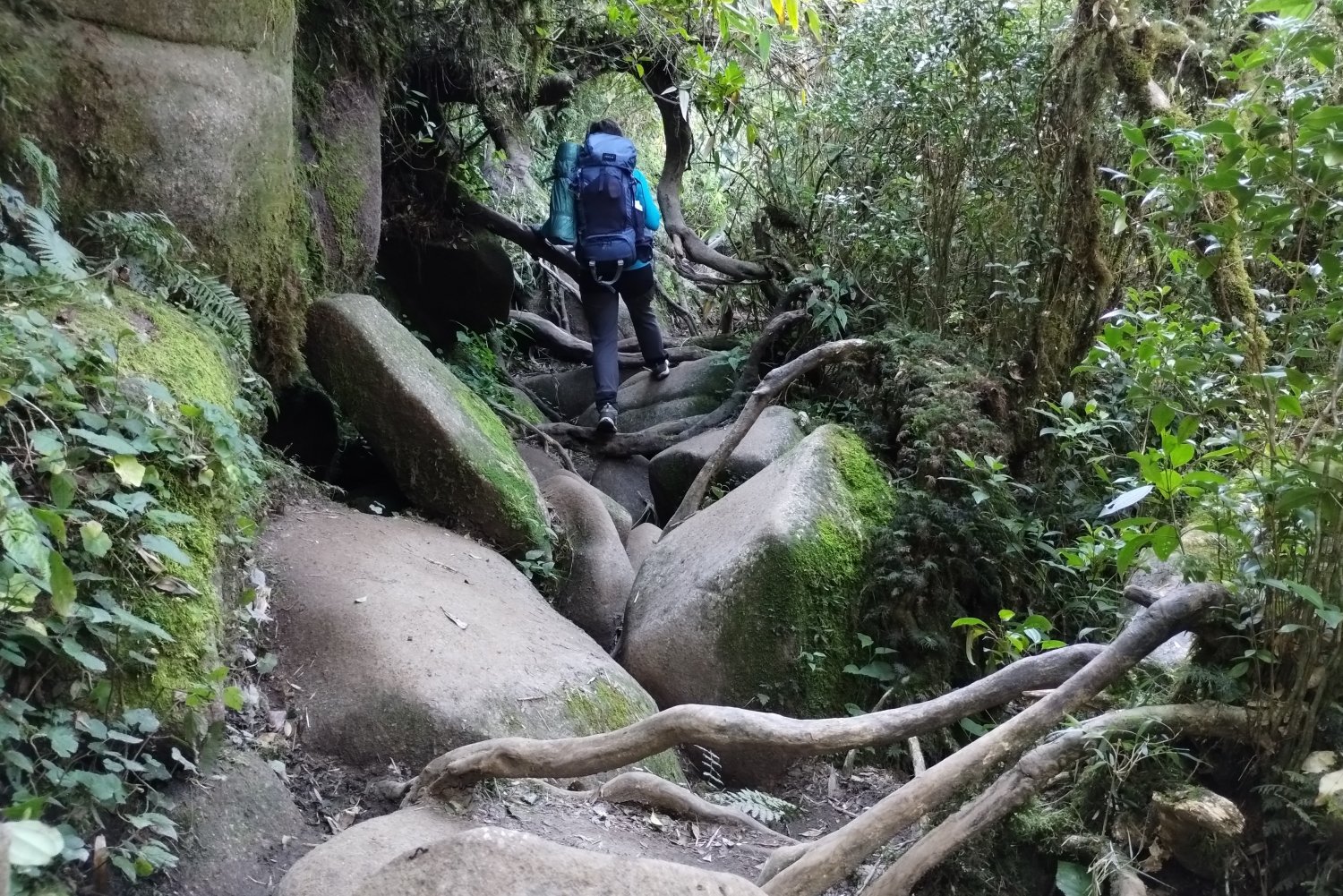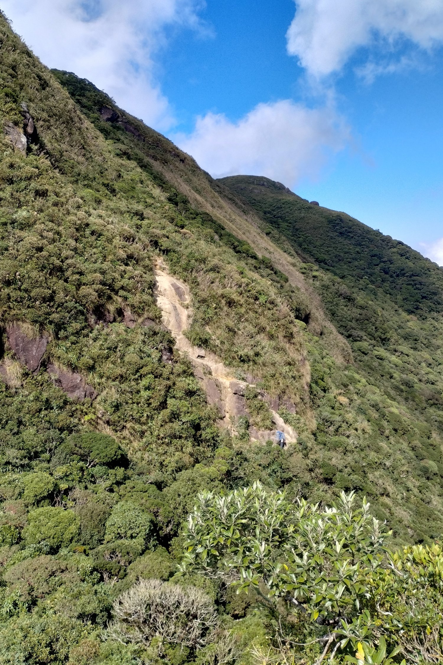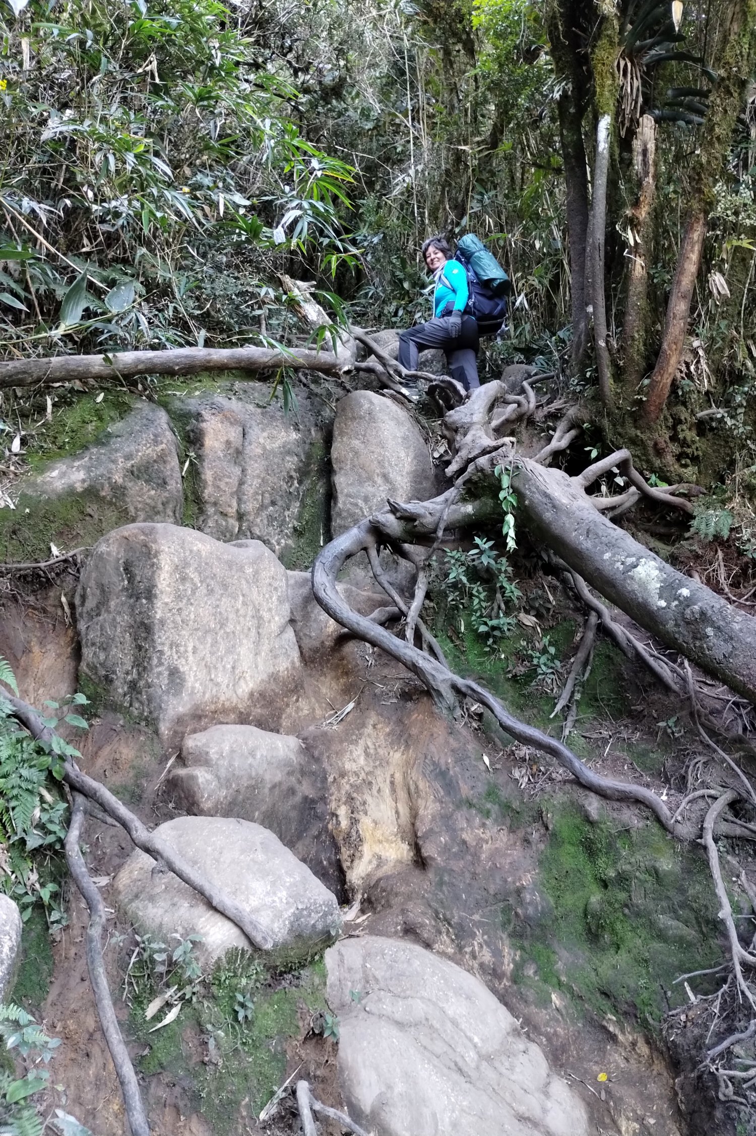 No trecho entre os picos Caratuva e Itapiroca a trilha se torna mais acidentada, com muitas raízes e trepa pedra pelo caminho em meio à mata.