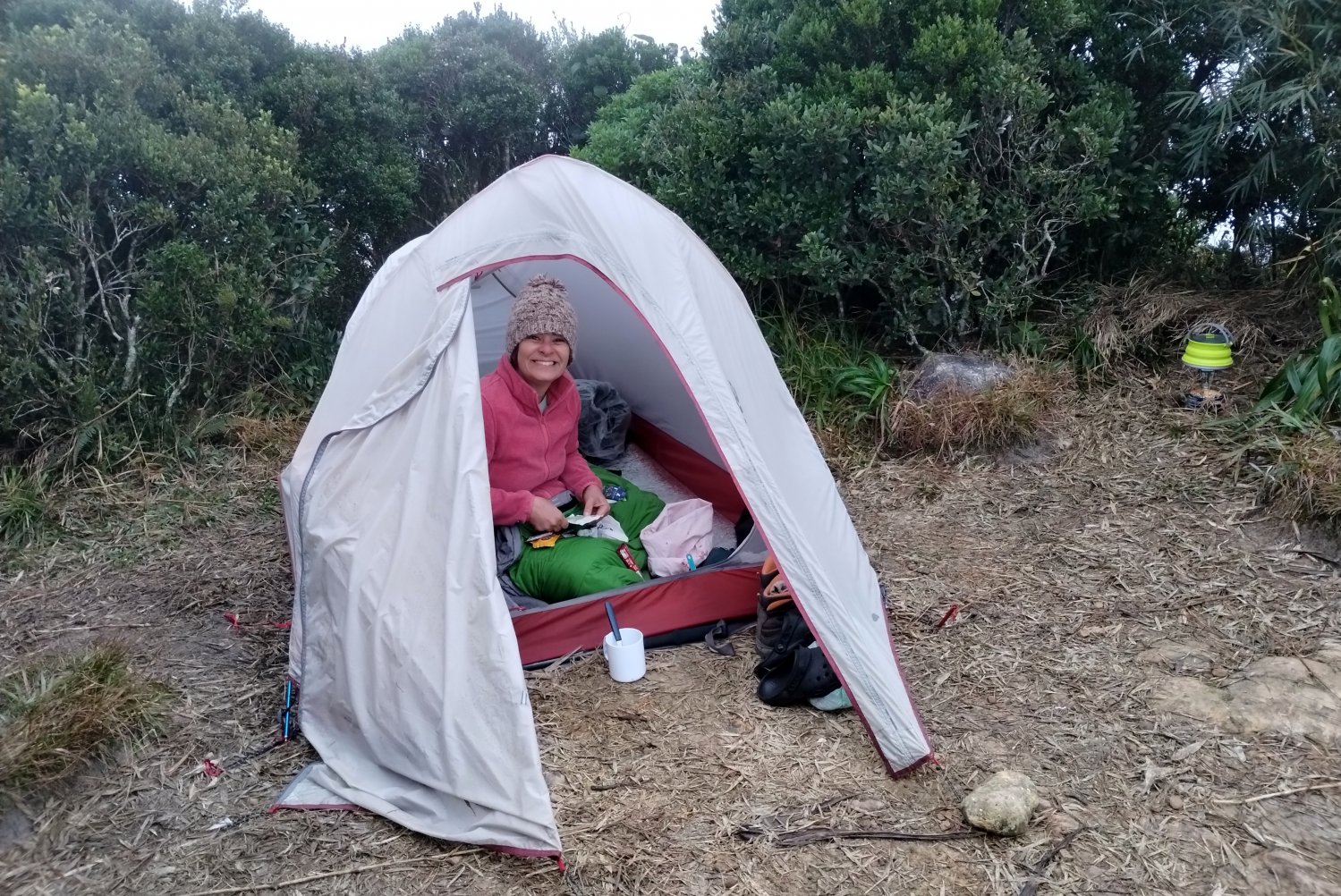 Chegamos ao Acampamento 2 por volta das 14:30, depois de percorridos 9,3 km ao longo de 6h e 30min, por uma trilha bastante exigente e exaustiva, onde encontramos com um casal montando o acampamento. O plano inicial era acampar no cume do pico Paraná, mas optamos por montar a barraca no Acampamento 2 e subir até lá sem peso.