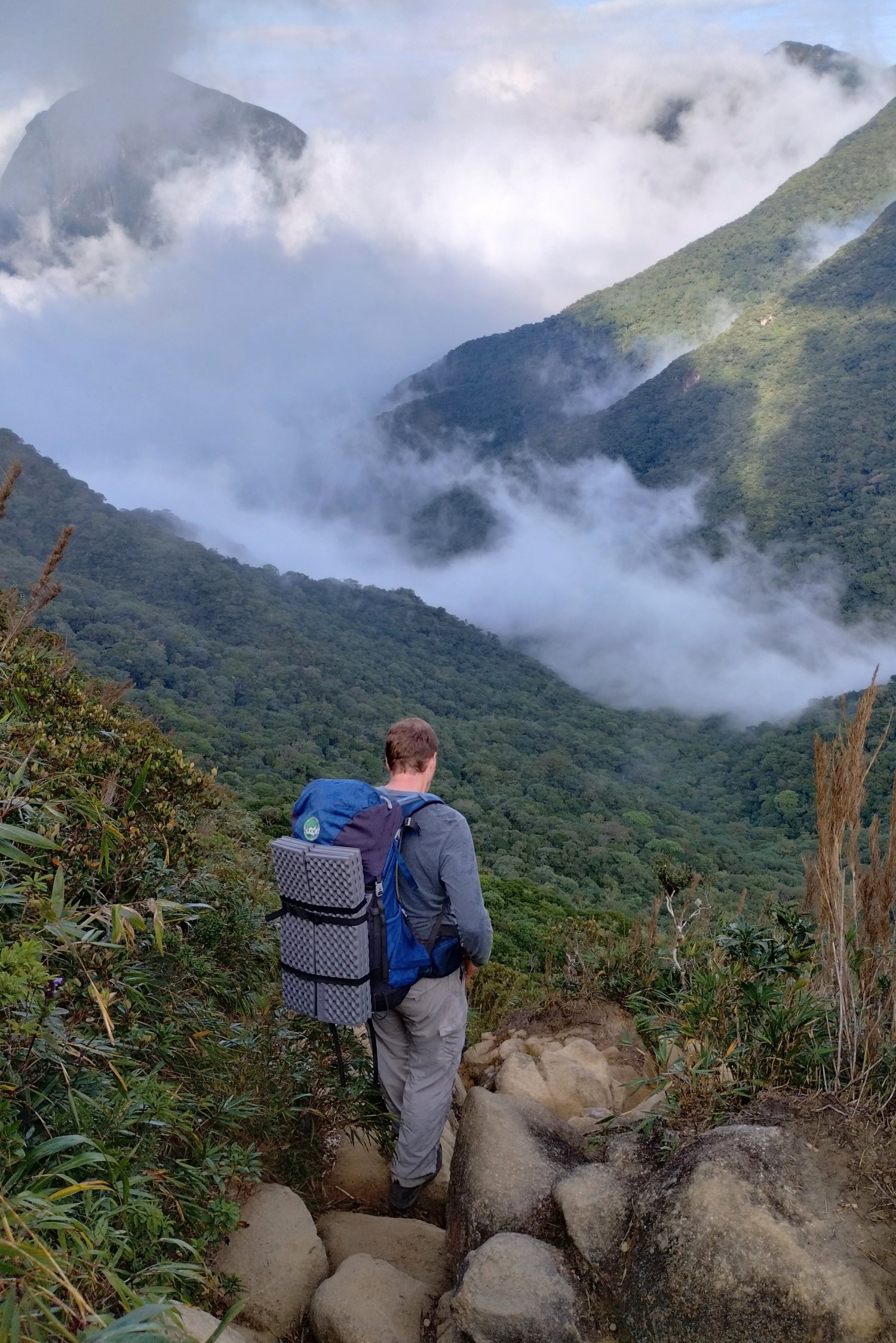 Acordamos cedo no dia seguinte, seguimos até o posto do IAT para o cadastro e iniciamos a trilha rumo ao pico Paraná, em uma bela manhã de sol e céu azul. O primeiro trecho até a bifurcação para o pico Caratuva, passando pelo morro do Getúlio, é uma subida sem maiores desafios, boa parte em meio a uma mata em regeneração, onde pinheiros exóticos invasores (Pinus elliottii) se destacam na paisagem, pontuando as encostas de toda a serra, num triste presságio de que, em algumas décadas, a região toda poderá ser convertida em um imenso pinheiral.