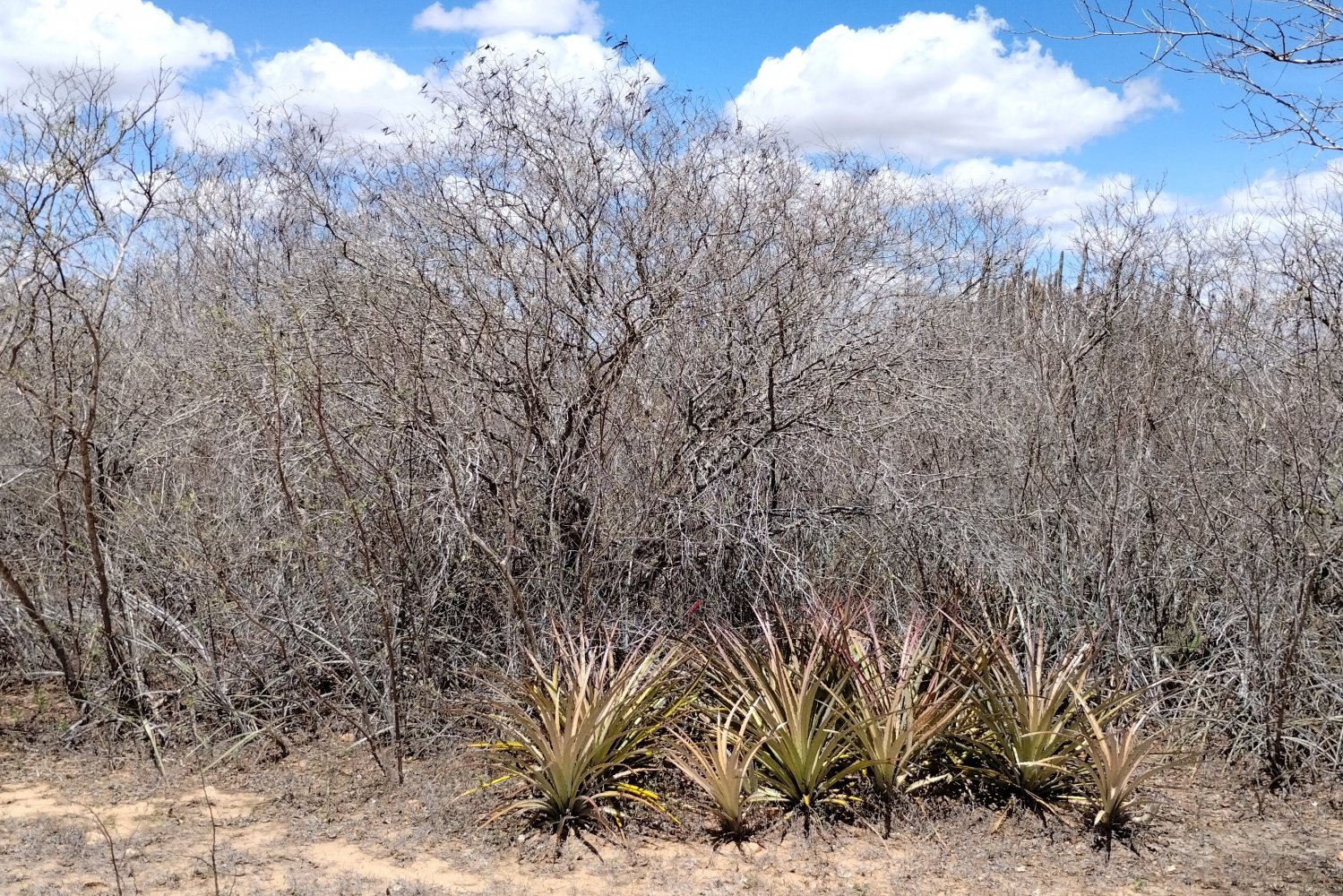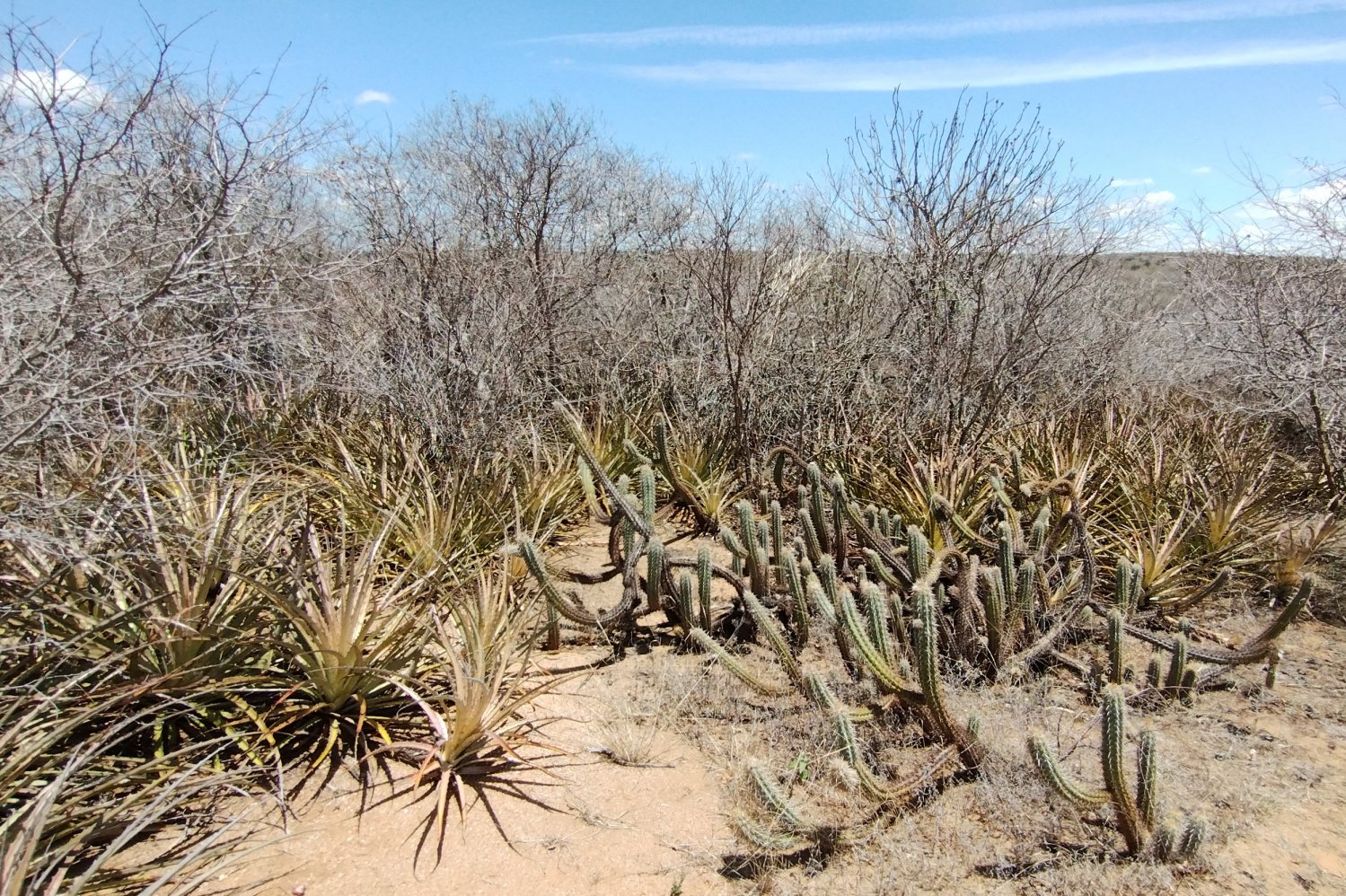 Apesar de um número reduzido de espécies vegetais, a caatinga possui uma beleza peculiar. Sua marca registrada são os espinhos e a “impenetrabilidade”. Por diversas vezes tentei me embrenhar por alguns trechos para explorar melhor o local, porém, sem muito sucesso. Uma barreira formada por cactos, bromélias e arbustos espinhentos, como a jurema-preta (Mimosa tenuiflora), tornavam minha progressão impossível em boa parte dos locais visitados.