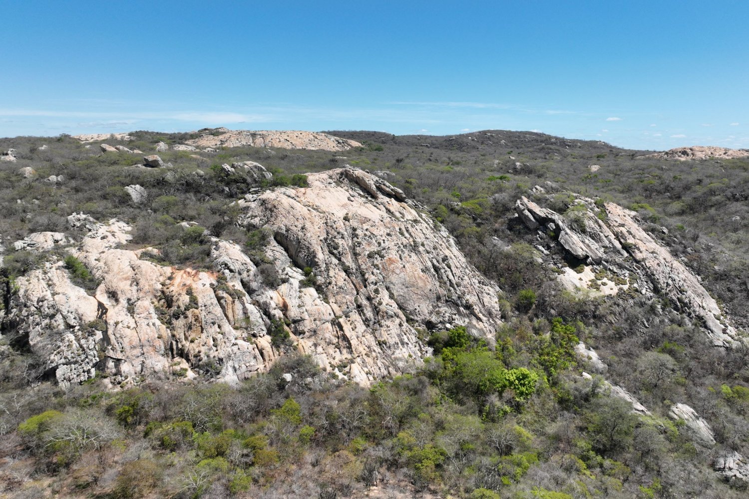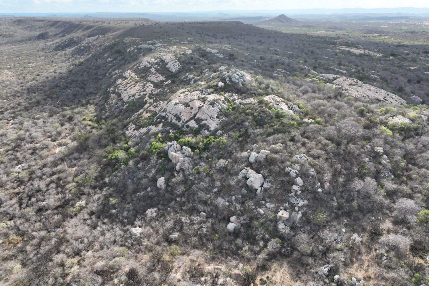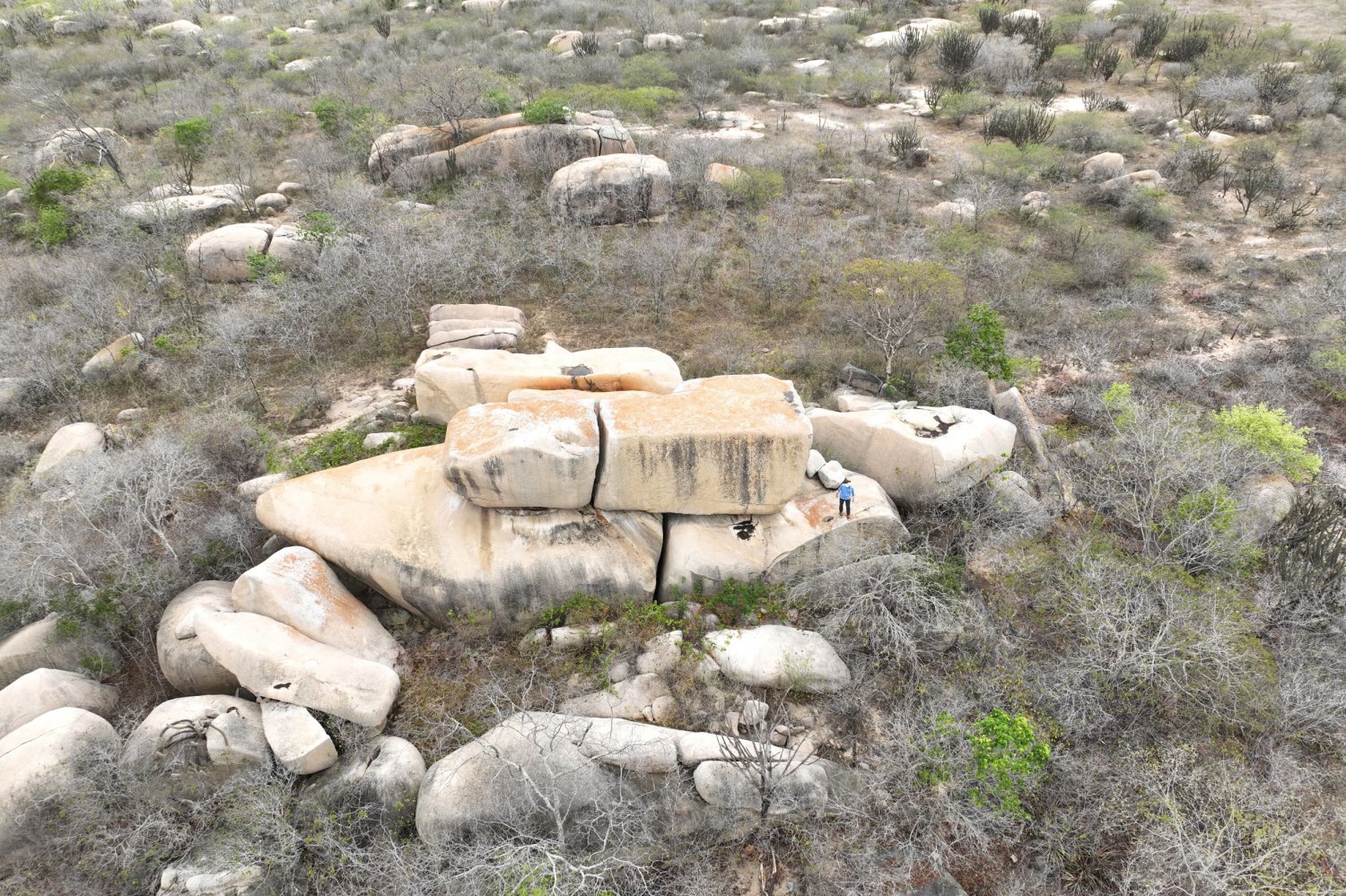 Na encosta de um tabuleiro (chapada) na região de Nova Palmeira, tomamos conhecimento da existência de uma cavidade denominada localmente como “Furna da Onça”. Com a ajuda do drone, traçamos uma rota até a sua possível localização para que, em seguida, eu pudesse me embrenhar na mata arbustiva, na tentativa de alcançá-la. Aproveitando algumas picadas precárias feitas por garimpeiros de quartzo, consegui chegar ao afloramento rochoso, vencido em parte com algumas escalaminhadas e muita aderência. Depois de algumas tentativas e erros encontrei a tal furna (mas não a onça!), caracterizada por uma extensa projeção em rocha com teto baixo, repleta de fezes de mocó (Kerodon rupestris), roedor típico do semiárido. A aventura me custou uma calça de trilha, que ficou bem rasgada ao final, por conta das inevitáveis moitas de espinhos que encontrei pelo caminho.