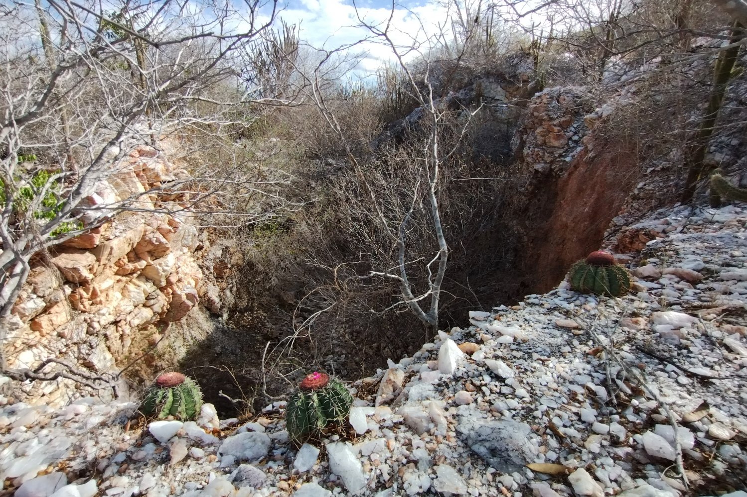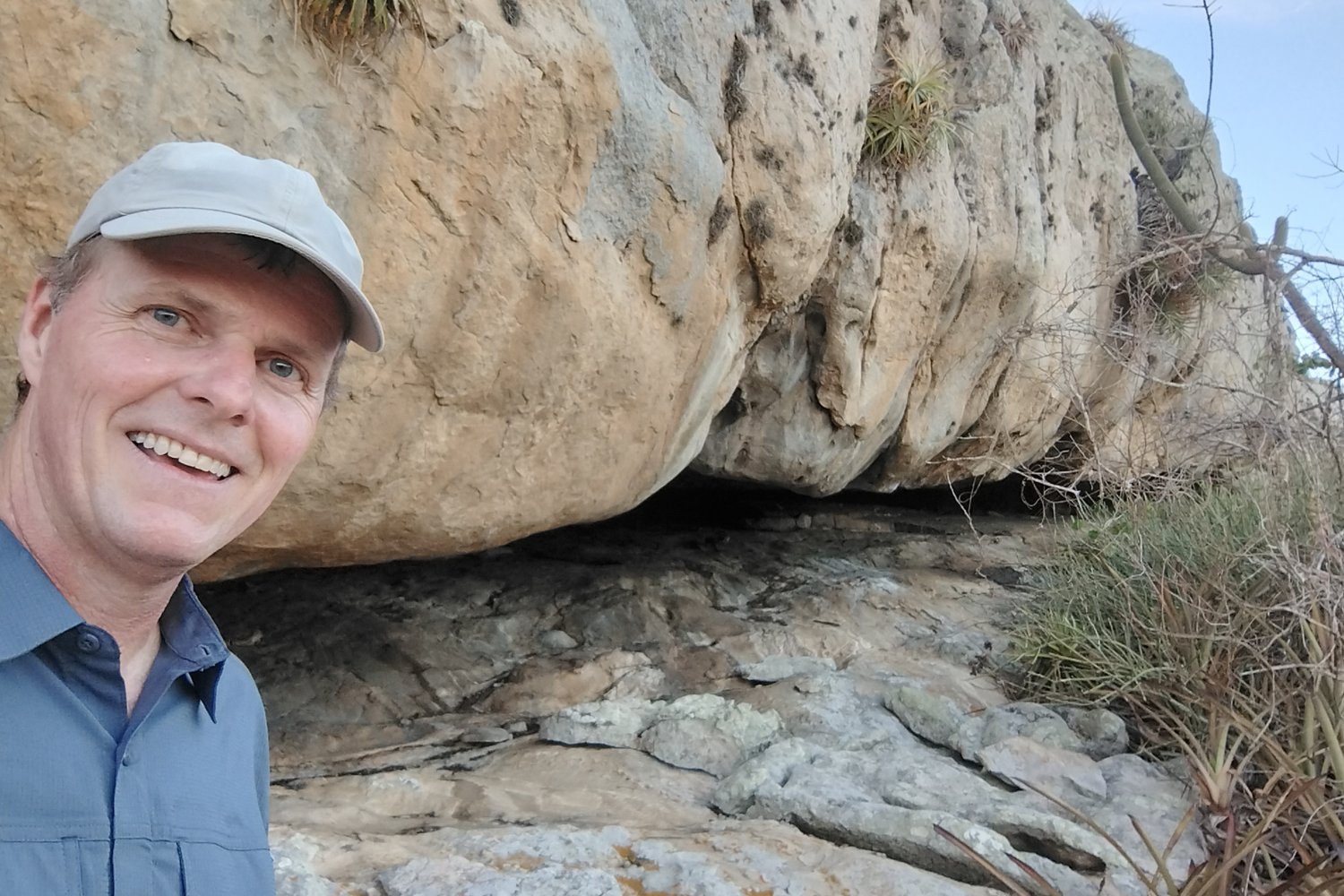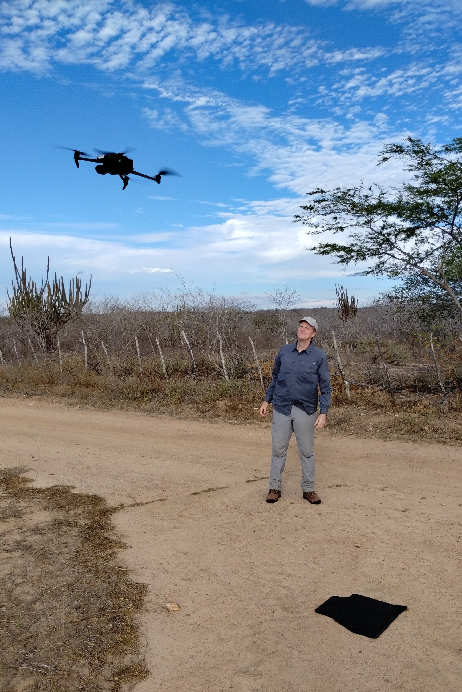 Na encosta de um tabuleiro (chapada) na região de Nova Palmeira, tomamos conhecimento da existência de uma cavidade denominada localmente como “Furna da Onça”. Com a ajuda do drone, traçamos uma rota até a sua possível localização para que, em seguida, eu pudesse me embrenhar na mata arbustiva, na tentativa de alcançá-la. Aproveitando algumas picadas precárias feitas por garimpeiros de quartzo, consegui chegar ao afloramento rochoso, vencido em parte com algumas escalaminhadas e muita aderência. Depois de algumas tentativas e erros encontrei a tal furna (mas não a onça!), caracterizada por uma extensa projeção em rocha com teto baixo, repleta de fezes de mocó (Kerodon rupestris), roedor típico do semiárido. A aventura me custou uma calça de trilha, que ficou bem rasgada ao final, por conta das inevitáveis moitas de espinhos que encontrei pelo caminho.