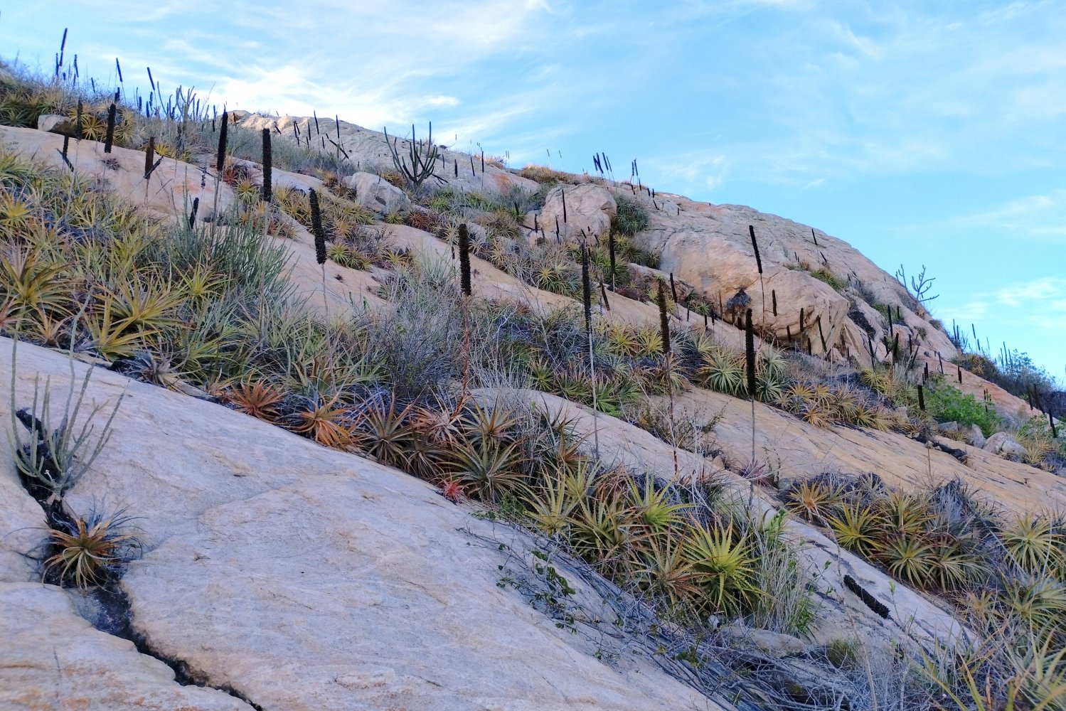 Os pendões florais secos de uma espécie de bromélia (Encholirium spectabile) dão a ideia de que as serras foram alvejadas por centenas de flexas.