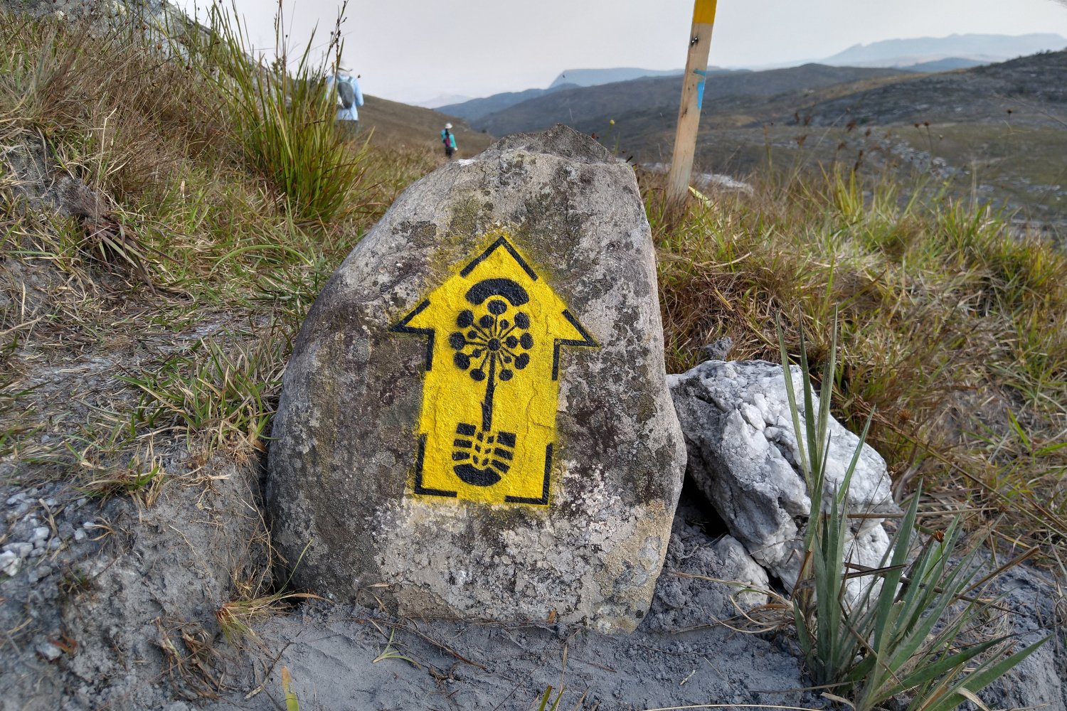 A sinalização é um componente fundamental em qualquer trilha de longo curso, não apenas para transmitir aos usuários informações sobre o sentido preferencial e mudanças de direção ao longo do percurso, mas, principalmente, por conferir uma identidade à trilha. E não se trata de uma ideia nova. A utilização de marcas pintadas, na forma de barras, símbolos ou setas já vem sendo adotada em outros países há muito tempo. Nosso grande mérito foi a padronização de um sistema original, simples e autoexplicativo de sinalização, na forma de pegadas pretas ou amarelas inseridas dentro de uma seta, conforme detalhado no Manual de Sinalização de Trilhas do ICMBio.