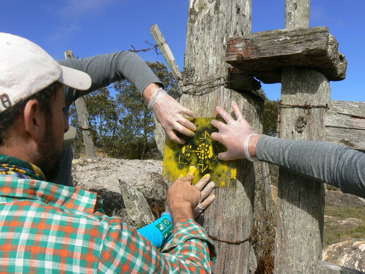 Para marcar o traçado inicial desta travessia, adotamos estacas finas de madeira com a extremidade pintada de amarelo, dispostas em pontos específicos, de maneira a indicar o rumo a ser tomado. Na medida em que a trilha ia ficando nítida no solo, as estacas eram retiradas ou transferidas para outros trechos. Este procedimento foi fundamental para orientar os primeiros usuários e evitar a abertura de atalhos e trilhas secundárias em uma região altamente suscetível ao desencadeamento de processos erosivos. Mas, na medida em que cada vez mais pessoas se interessavam em realizar a travessia, a necessidade de adoção de um sistema de sinalização passou a ser uma prioridade.