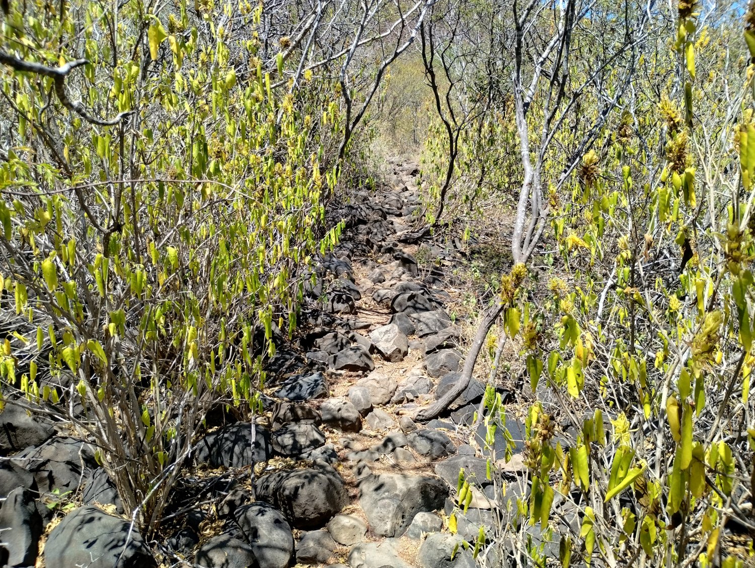 Percorri os 3 km da subida sem pressa, com uma breve pausa para contemplar a paisagem, em cerca de 1 hora e 20 minutos, sem maior dificuldade. O maior desgaste ficou por conta do forte calor, especialmente no trecho inicial da subida até o colo ou platô, onde começam os blocos de rocha basáltica.