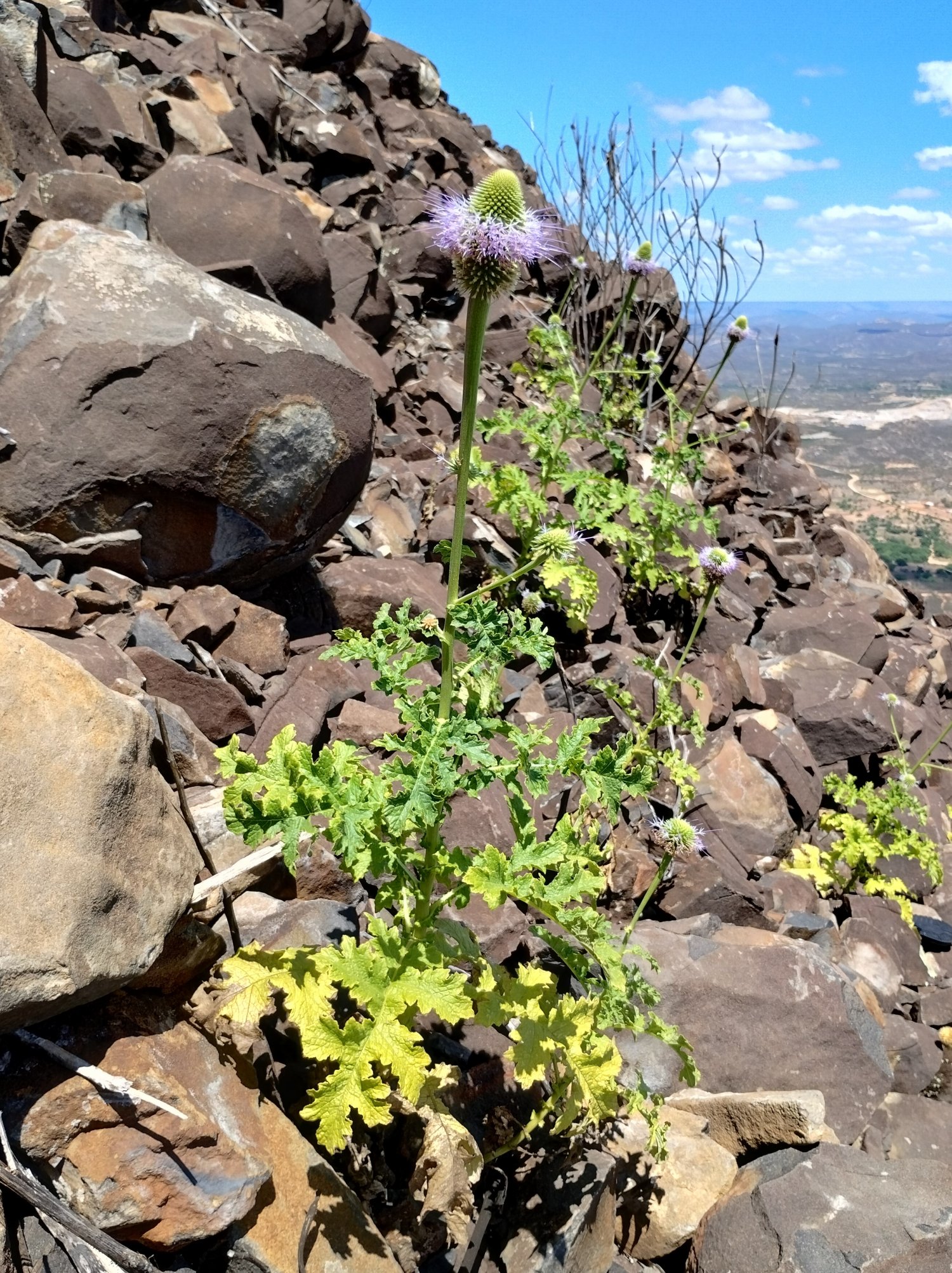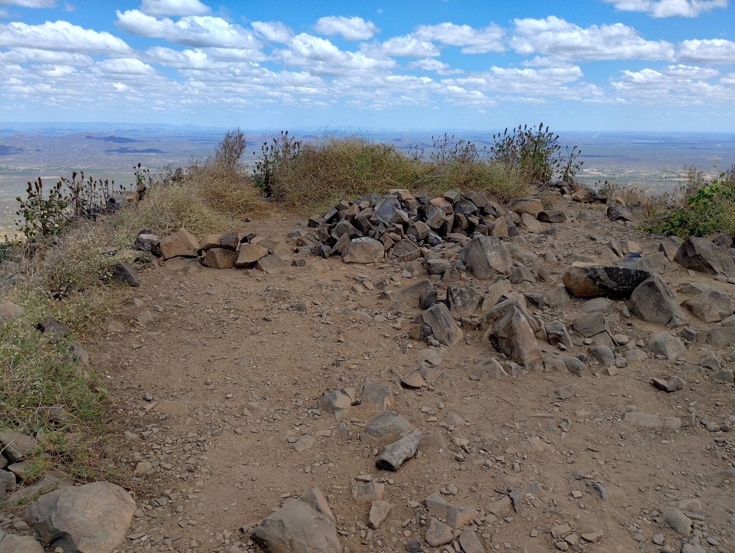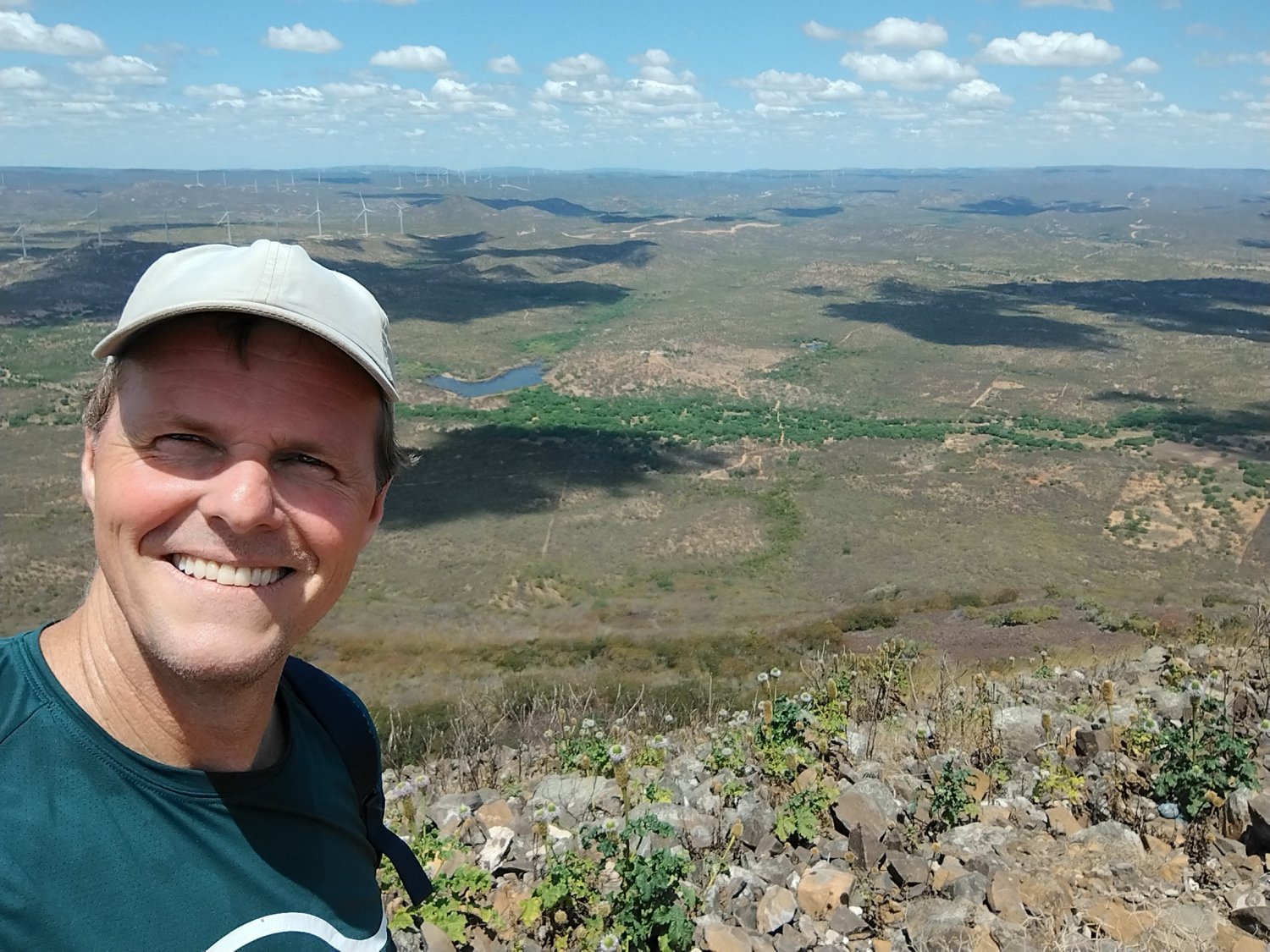 O cume propriamente dito é bastante degradado por fogueiras, lixo e pixações, com uma área pequena formada por pequenos trechos de solo exposto, onde as pessoas costumam acampar, e blocos de rocha empilhada. Mas nos proporciona uma ampla vista de toda a região, com a porção sul praticamente toda tomada por parques eólicos. Em agosto, a caatinga ainda guardava um pouco do verde característico do final do período das chuvas, que normalmente vai de fevereiro a julho.