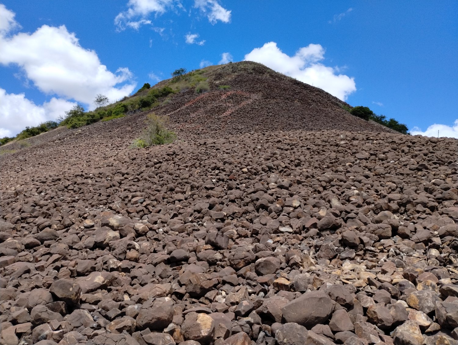 A trilha termina em um platô, onde tem início o trecho formado por blocos de rocha vulcânica que caracterizam o neck subvulcânico do Cabuji.