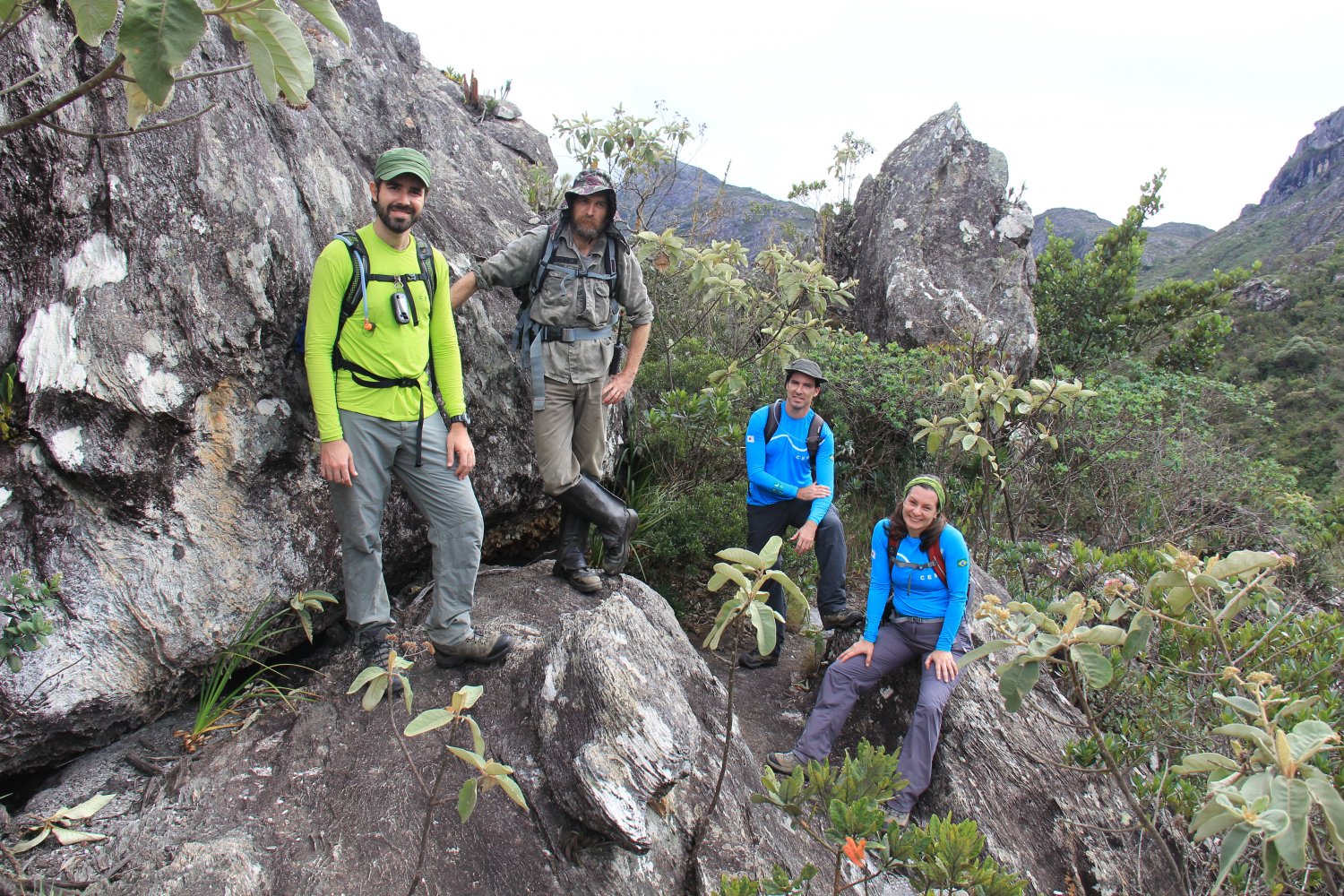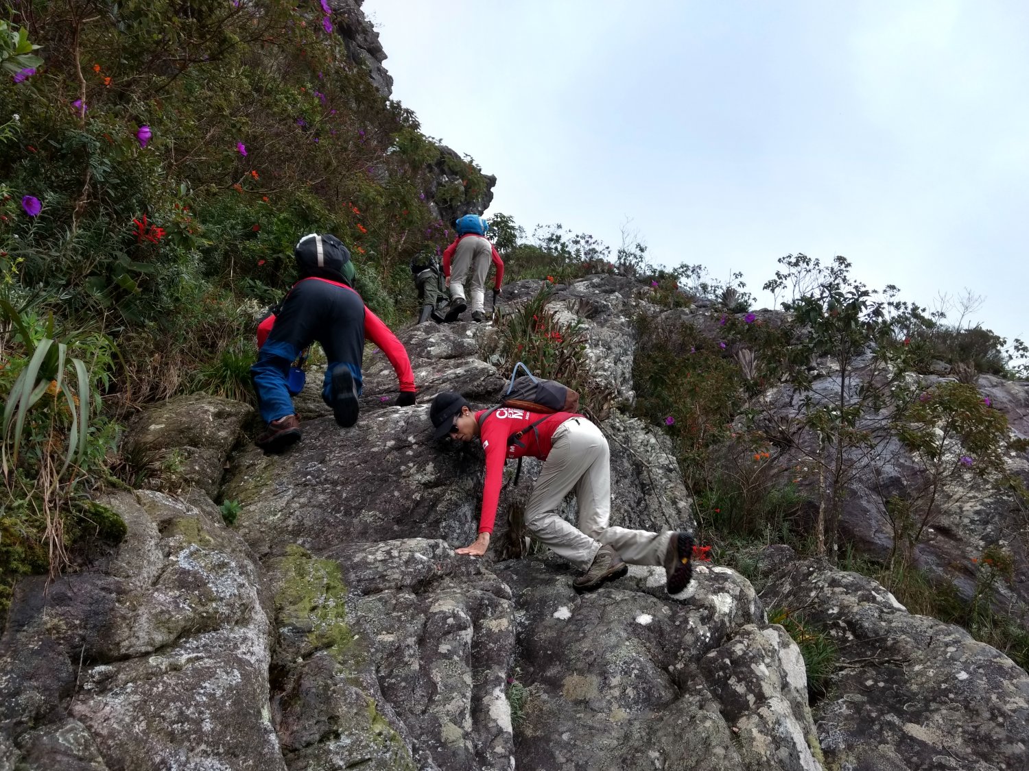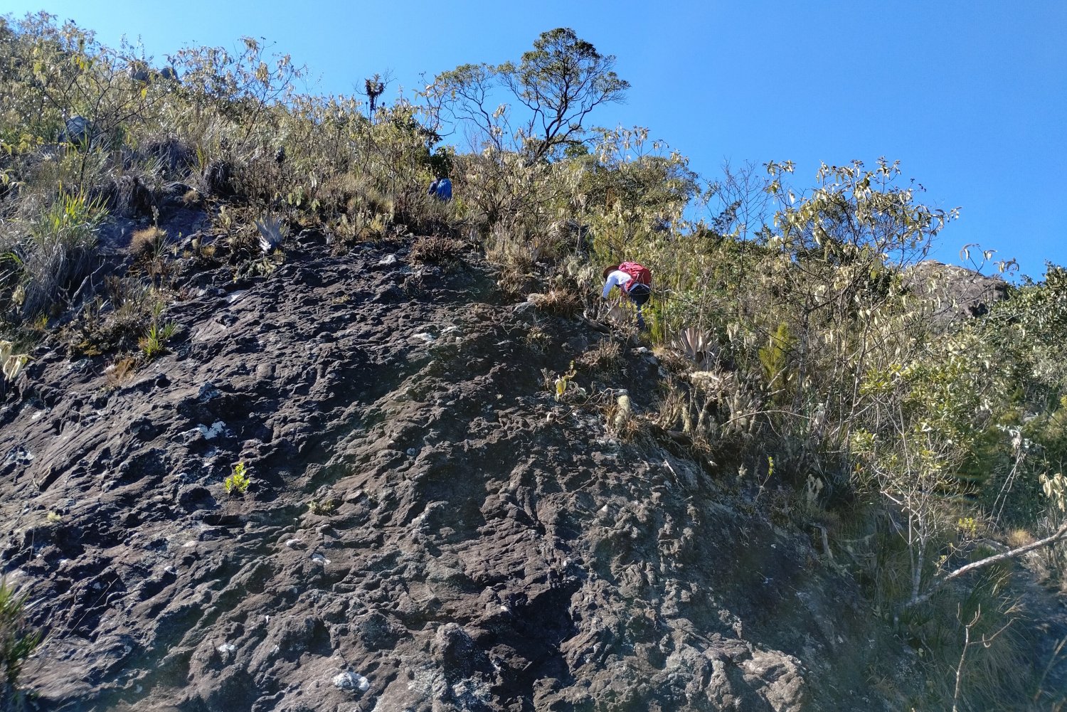 Em seguida, tem início o ataque final ao cume, por um trecho bastante íngreme, porém relativamente curto. Uma laje inclinada de rocha representa o “crux” da ascensão, especialmente se estiver molhada, exigindo um pouco mais de atenção. Finalmente chega-se a um extenso platô repleto de canelas-de-ema (Vellozia spp) e bromélias, que leva ao cume, que, até há pouco tempo, ainda era marcado por uma cruz de madeira com uma bromélia endêmica da Serra do Caraça (Vriesea marceloi) ao lado. Infelizmente não estão mais lá.