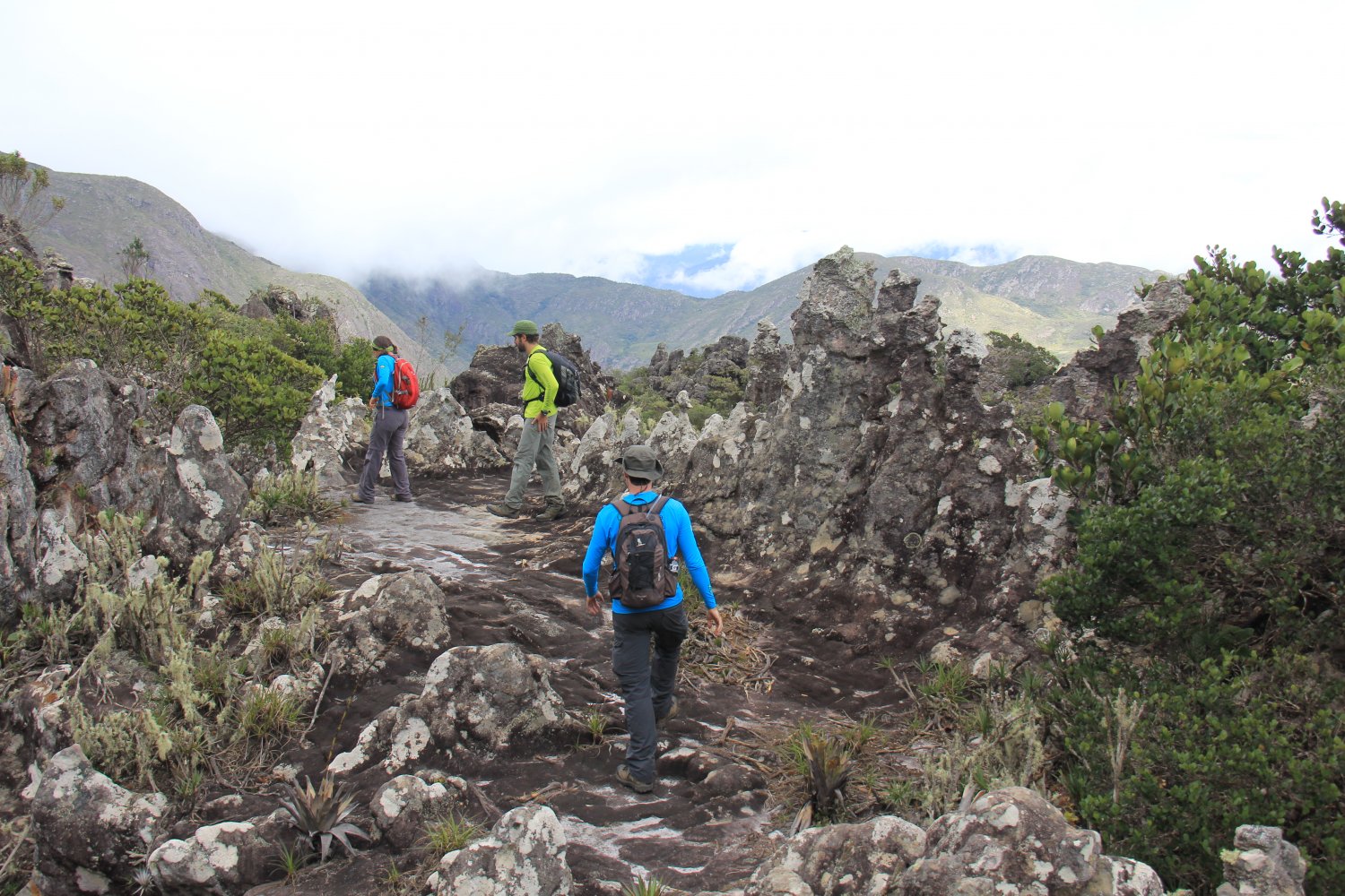 A caminhada se torna um pouco menos exaustiva, com uma maior extensão da trilha em relevo menos íngreme. A primeira parada costuma ser feita em um córrego, em meio a belíssimas formações rupestres, com projeções de rocha em variadas formas e tamanhos. Neste local também está outro ponto de referência importante, caracterizado por uma fenda com cerca de 15 metros de profundidade e pouco menos de um metro de largura, que corta a trilha. Hora de encher os recipientes de água e respirar um pouco.