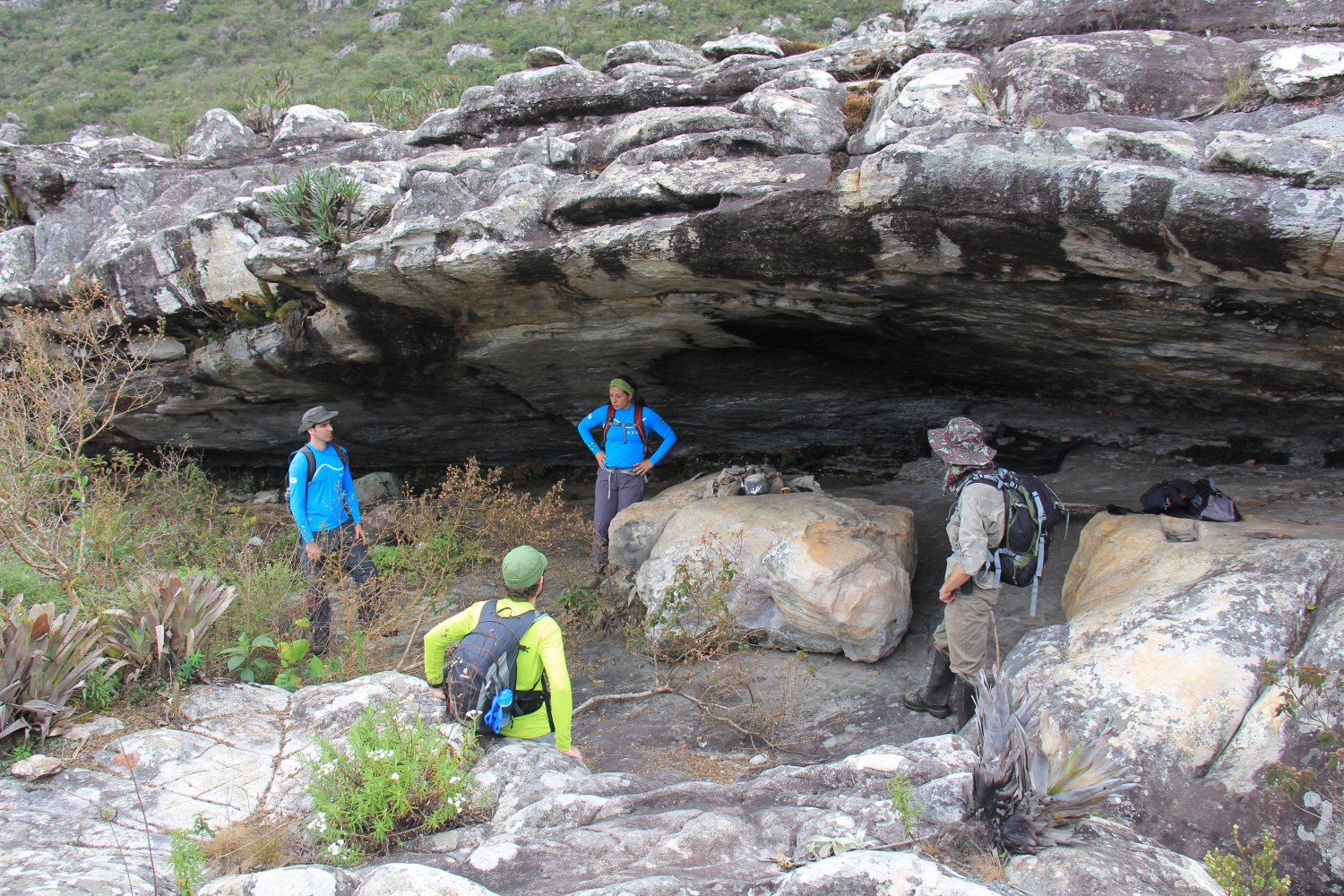 Pausa para descanso na "Concha", projeção de rocha utilizada como abrigo no passado (em 24/06/2017).