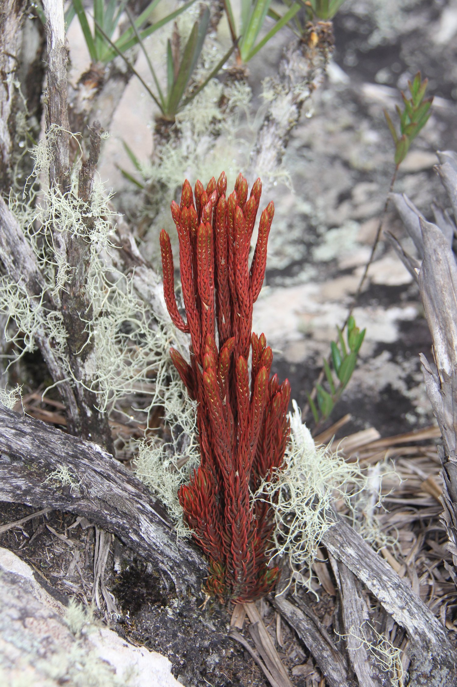 Exemplar de Phlegmariurus ruber, planta endêmica e criticamente ameaçada de extinção encontrada no acesso ao cume do Pico do Sol (em 24/06/2017).