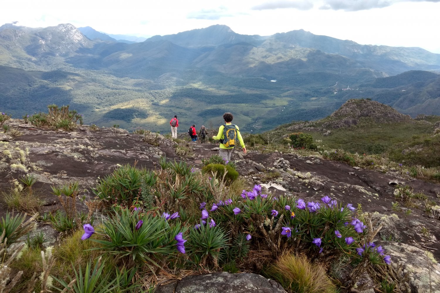 Belas paisagens compensam o esforço. Ao fundo os picos Trindade (1.910m) e Conceição (1.803m). À esquerda e bem ao fundo o Piçarrão (1.839m) (em 04/07/2024).