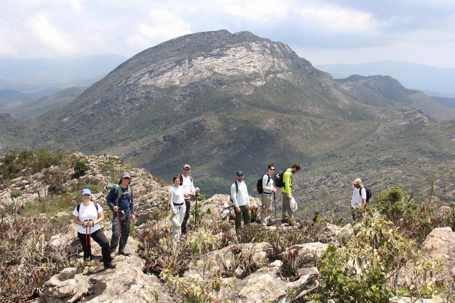 Turma do CEM em outubro de 2015 no cume do Pico Conceição (1.800m), com o Pico Trindade ou Pico Três Irmãos (1.908m) ao fundo.