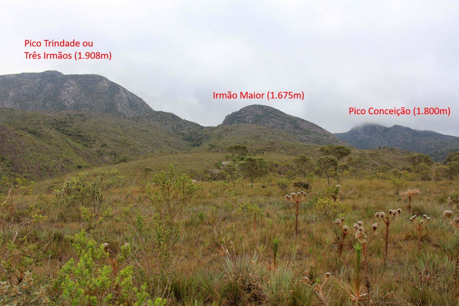 Em 24/10/2013 o Centro Excursionista Mineiro (CEM) galgou os cumes dos picos Conceição e Três Irmãos (ou Trindade), acompanhado pelo guia Neneco. O Pico Três Irmãos ou Trindade é formado por três cumes distintos. Chegamos pelo segundo mais alto e, em seguida, nos dirigimos ao maior deles, com altitude de 1.908 m obtida no GPS Garmin, próximo ao local onde foi encontrado um marco com o nome “Cruzeiro do Sul”. Ou seja: bem mais alto que os 1.675m oficialmente divulgados.