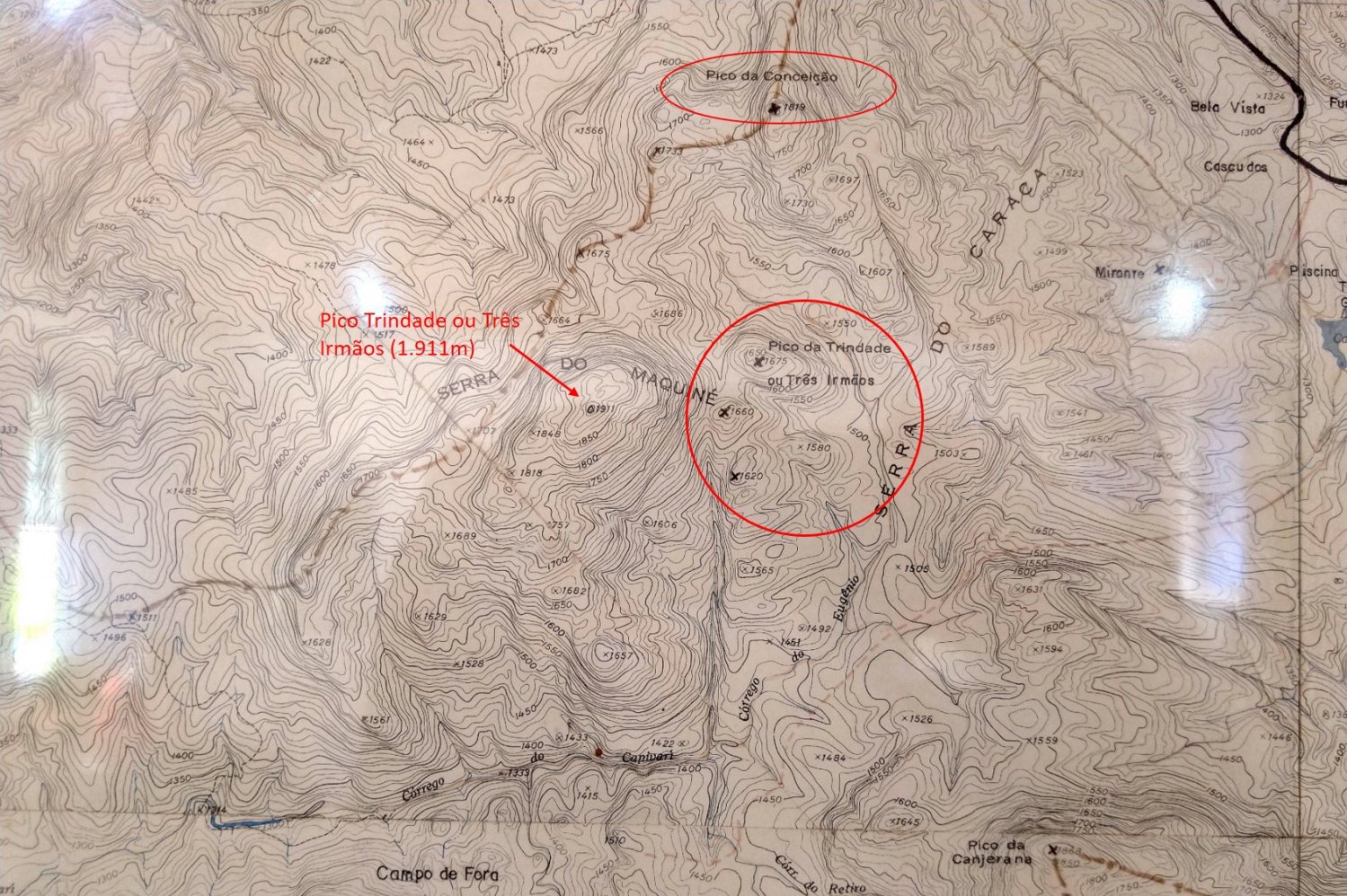 Na recepção do Santuário do Caraça existe um antigo mapa altimétrico da região, elaborado pelo Ministério das Minas e Energia, em escala 1:25.000, com a indicação dos principais acidentes de relevo, dentre eles as serras e os picos. O Pico Trindade ou Três Irmãos é marcado como um conjunto de três morros distintos, sendo o mais elevado com 1.675m, o que coincide com o que é descrito nas referências literárias mais antigas.