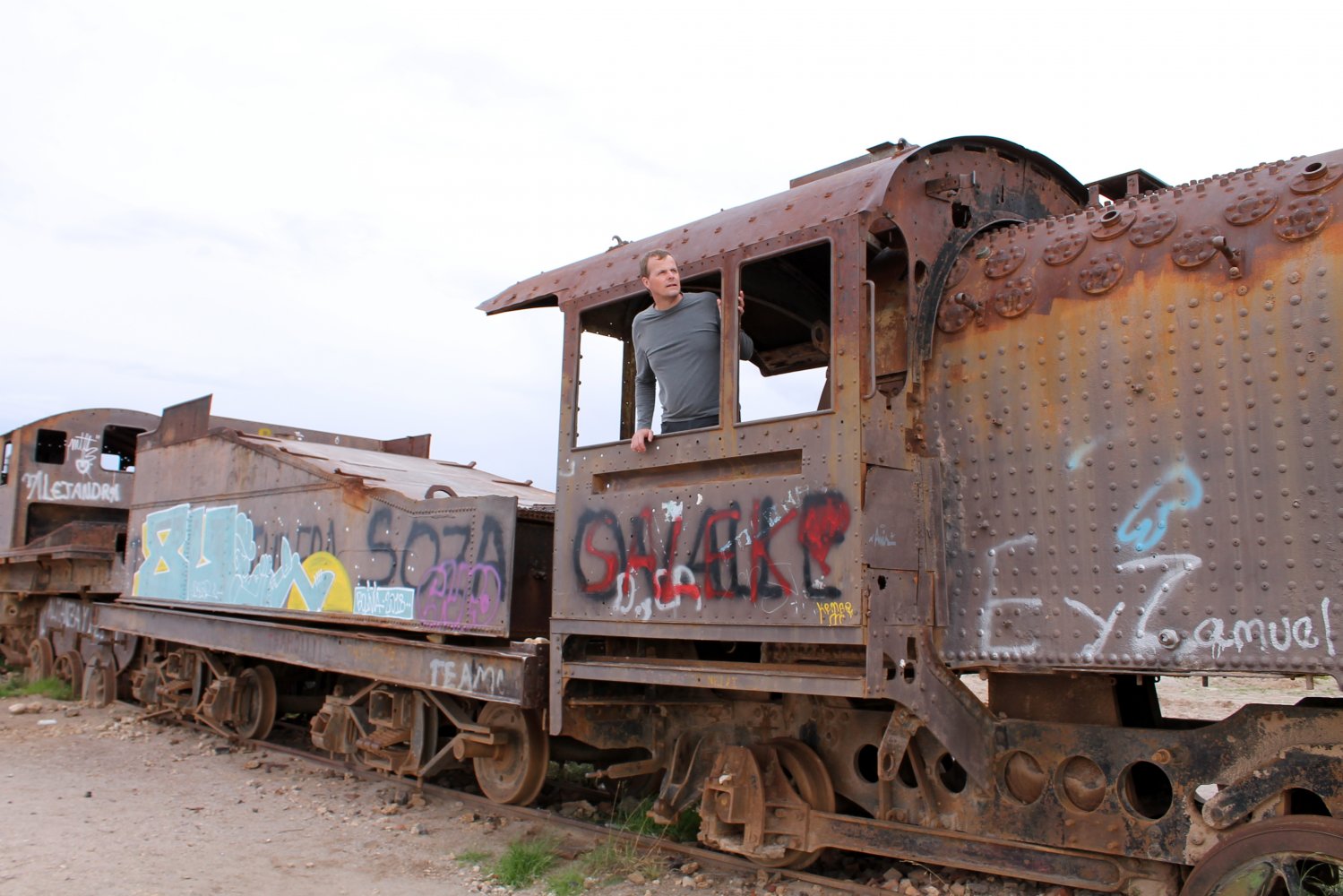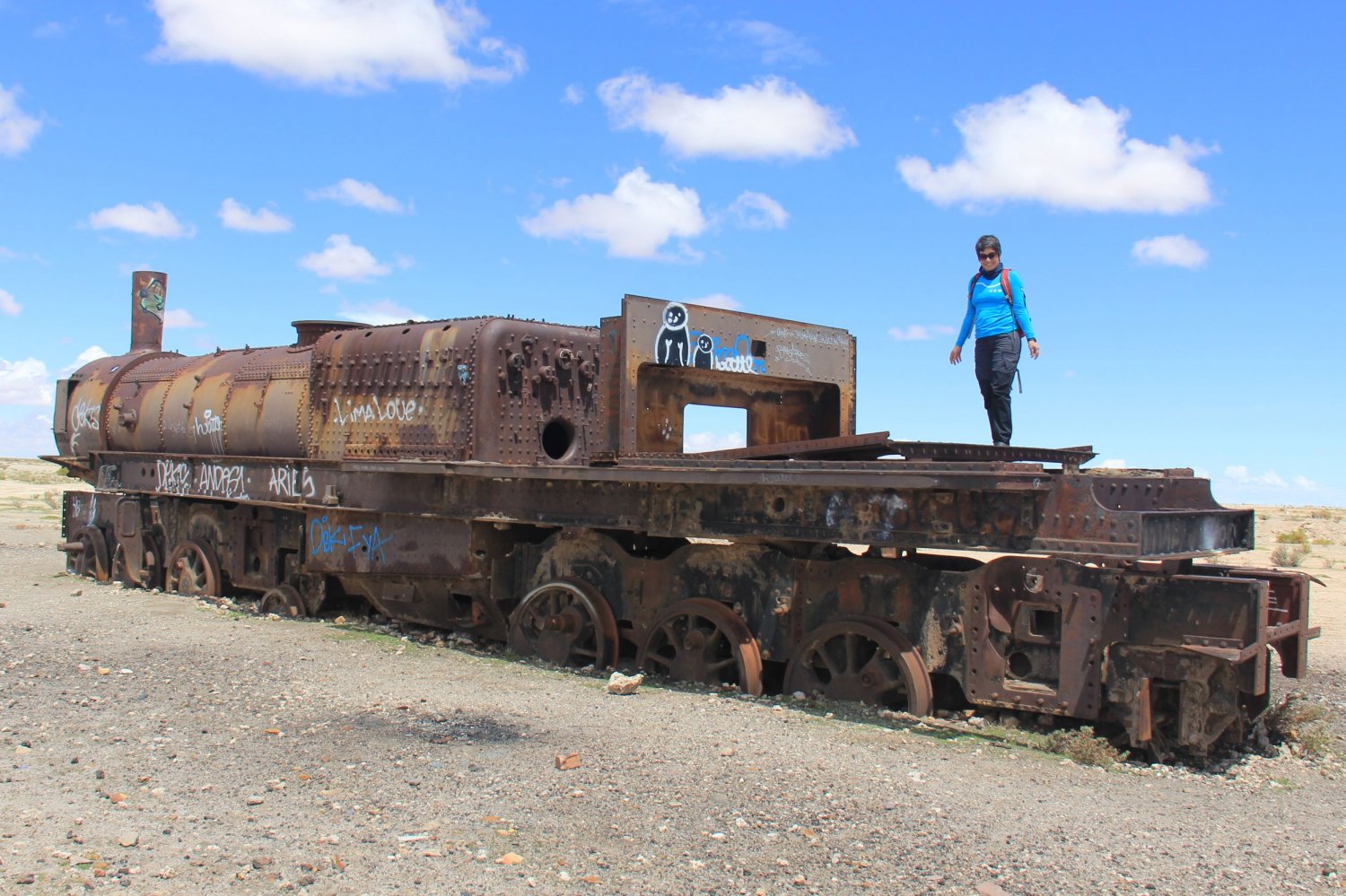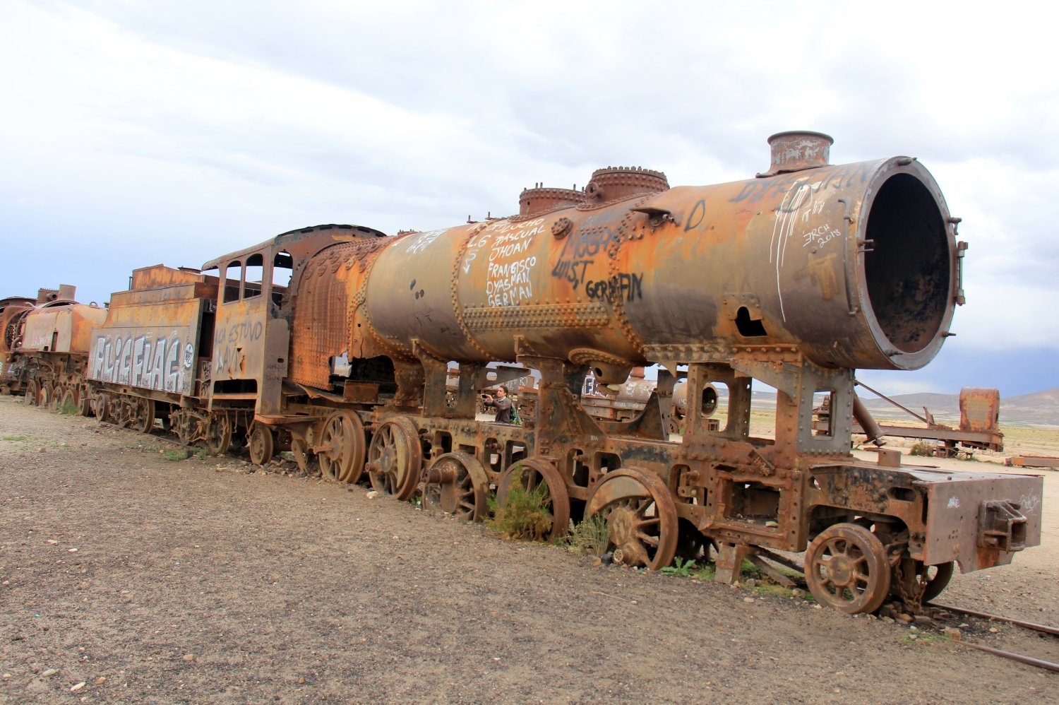 Uma das muitas locomotivas abandonadas no cemitério de trens de Uyuni.